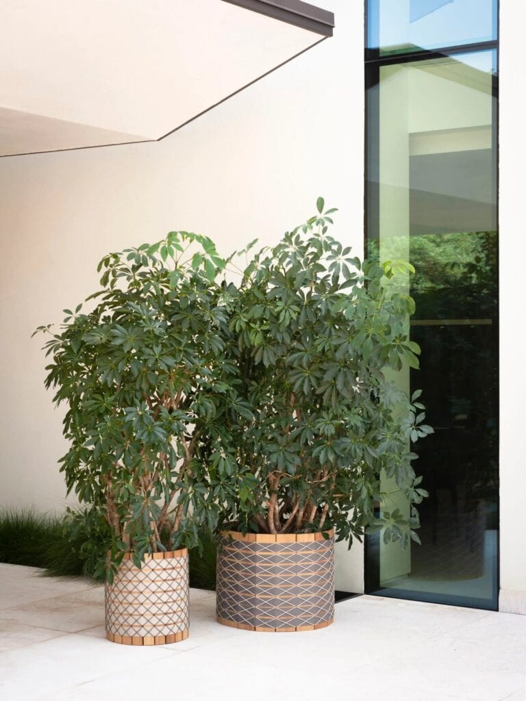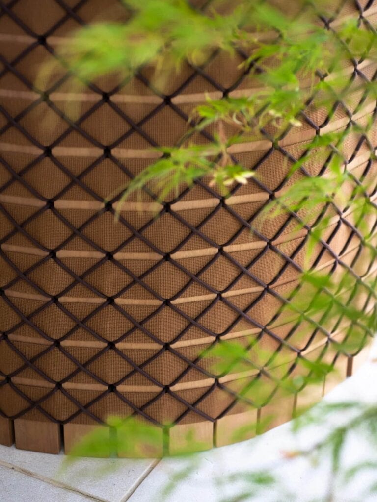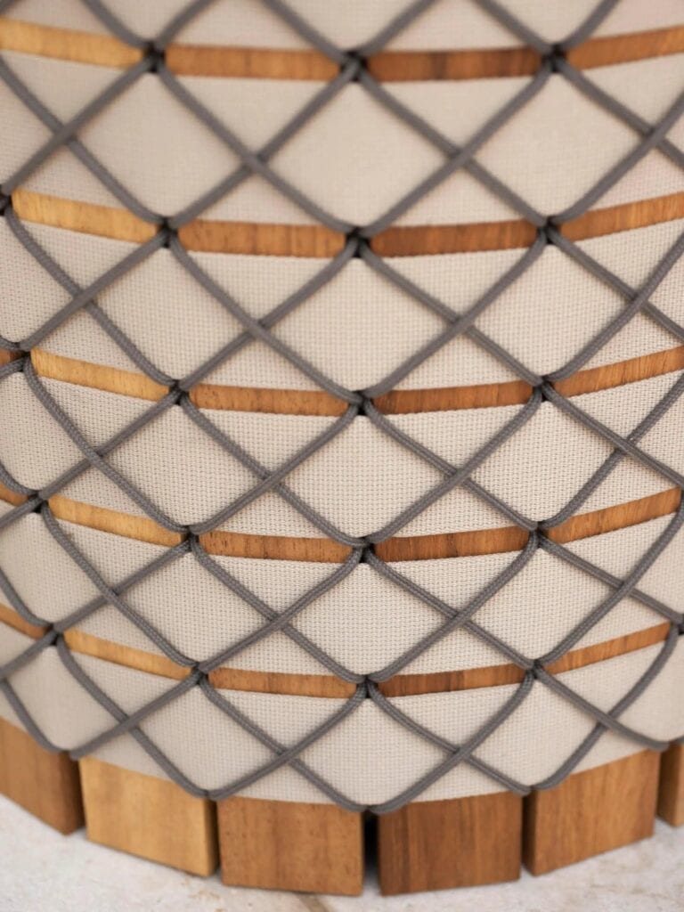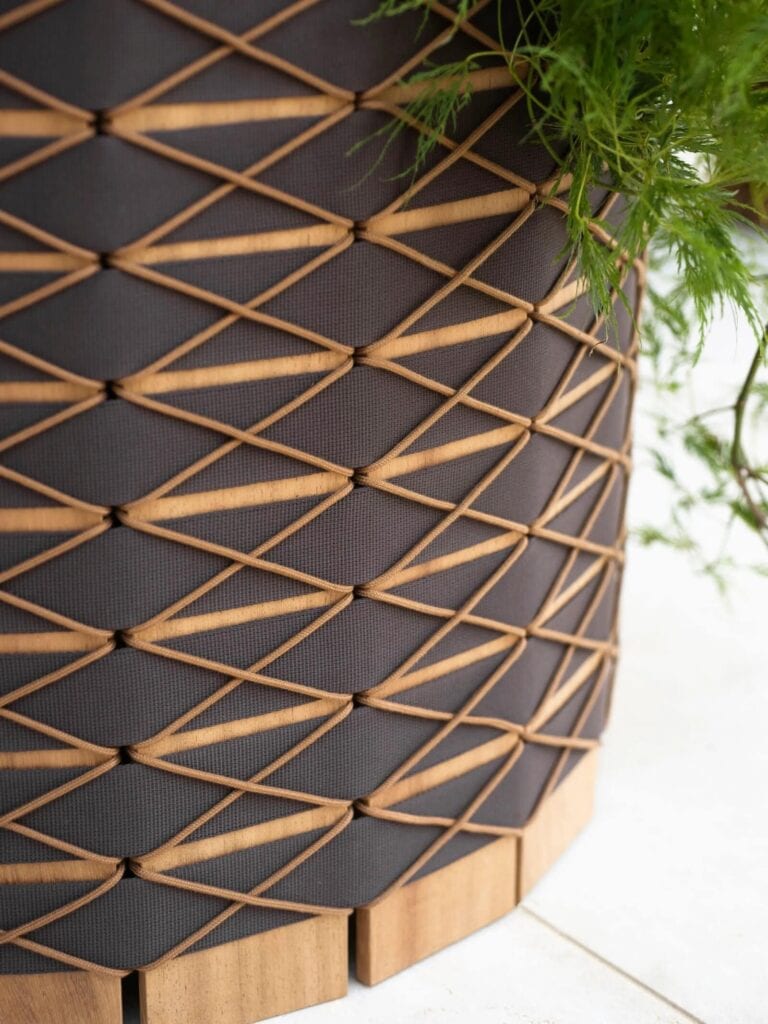 In den verschiedenen Formaten der modernen Pflanzgefäße aus Iroko-Holz erzeugen die Gurte als Flechtwerk ein Muster, das durch die feinen Schnüre ergänzt wird, die auf der gesamten Oberfläche des Zylinders Rauten bilden.