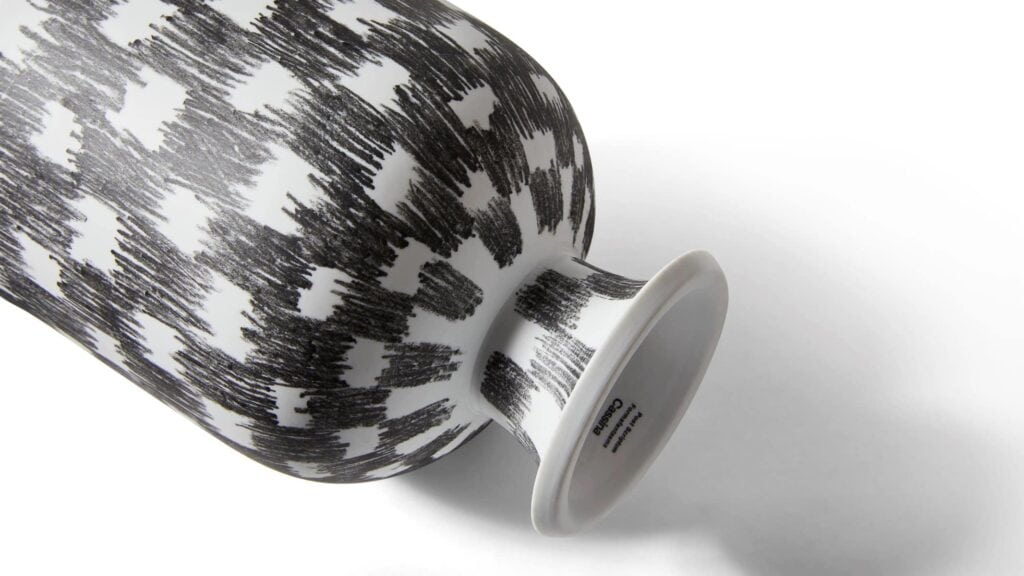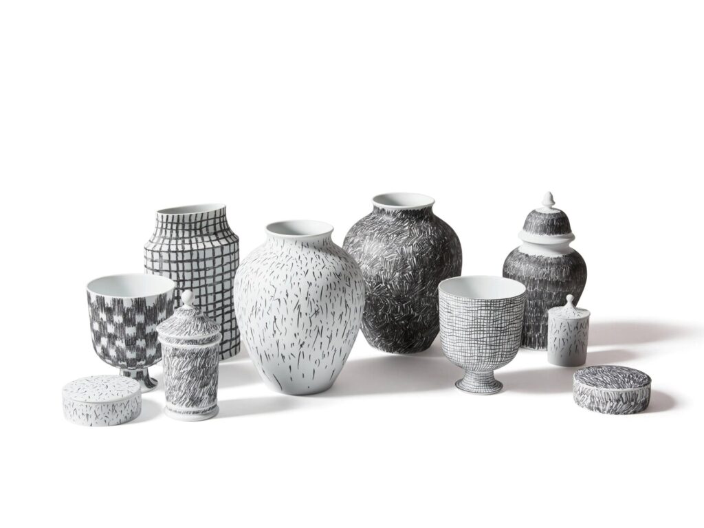Die Entwürfe von Formafantasma werden dank des Know-hows, des Könnens und der Erfahrung der Malermeister von Ginori 1735 zu Dekorationen auf Porzellan. Sie arbeiten auf natürliche Weise und hinterlassen ihre Spuren durch instinktive Bewegungen, abstrakte Zeichen, die das Konzept der Dekoration aktualisieren. Die Kollektion besteht aus einer Reihe von Vasen mit unterschiedlichen Formen, zeitgenössischen Objekten, die allein stehen oder zu grafischen Kompositionen zusammengefügt werden können. La particolarità della lavorazione consiste nella decorazione “a graffito” sulla porcellana bisquit ottenuta con una cottura diretta: il graffito viene disegnato sulla superficie con un pigmento nero e successivamente fissato.