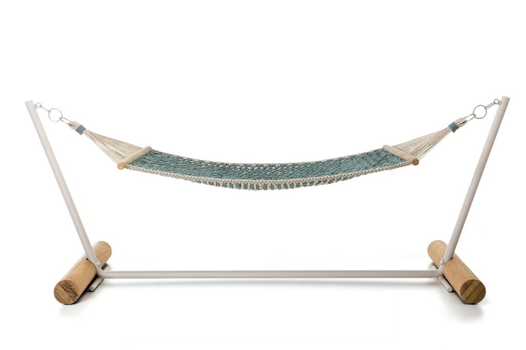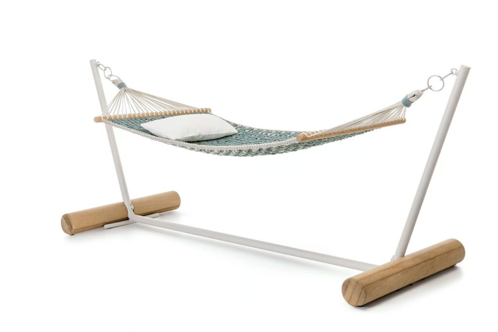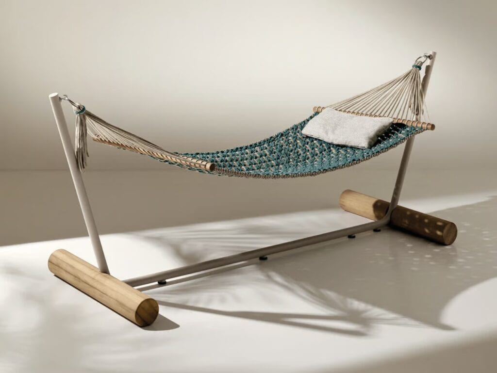 Patio ist eine freistehende Hängematte mit Gestell aus Aluminium Kalkstein und natürlichem Teakholz. Hängematte aus gewebtem Flachseil Laguna und Flachseil Light Grey. Details aus natürlichem Teakholz.