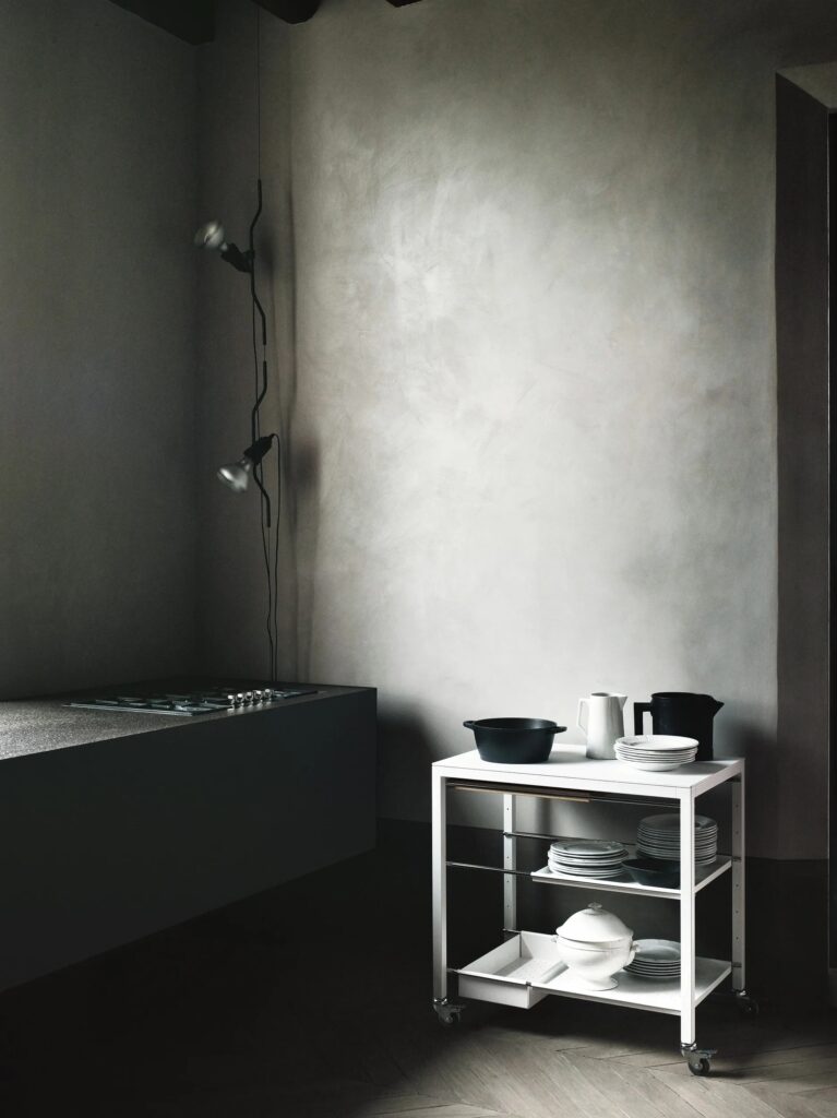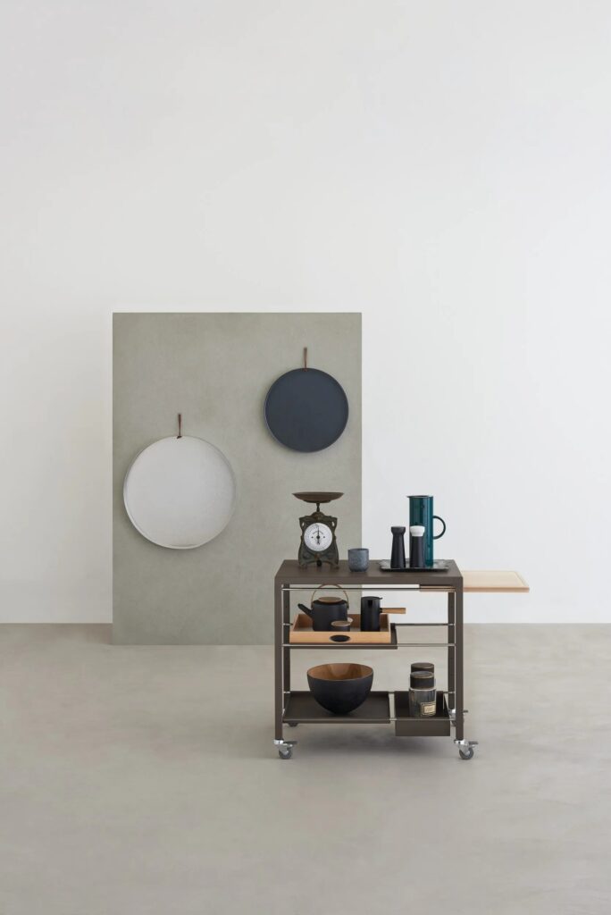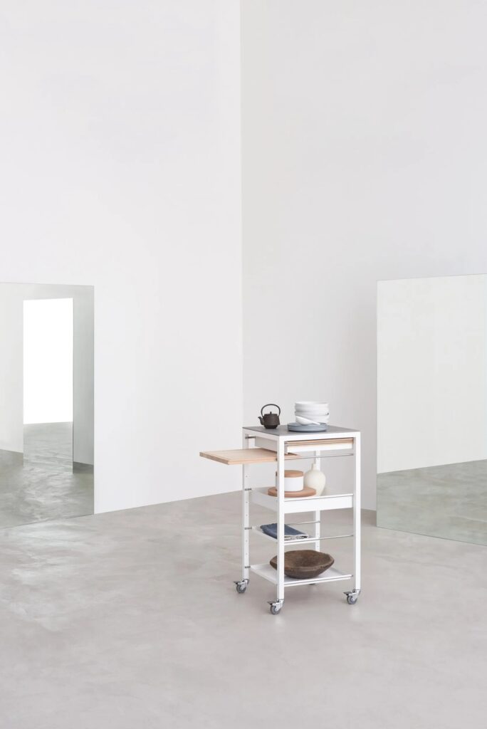 Rollwagensystem mit Stahlgestell Querschnitt 30x30mm, Verbindungselemente aus Druckguss. Gestell in den Ausführungen matt lackiert und Platten aus temperiertem Glas, Laminat Fenix®, Schichtlaminat oder Keramik.