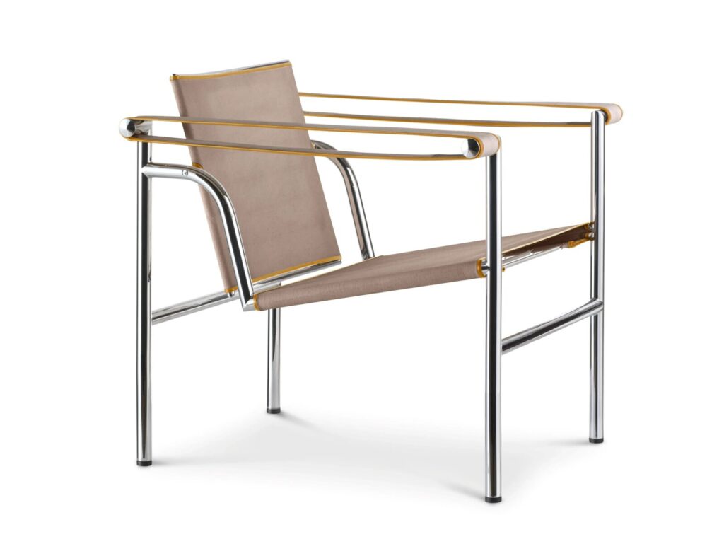 Diese Version des Armlehnstuhls Fauteuil à dossier basculant wurde auf der ersten Ausstellung der Union des Artistes Modernes 1930 präsentiert, auf der die Designer zeigten, dass die Möbelstücke, die sie im Vorjahr im Salon d'Automne präsentiert hatten, mit einer Vielzahl an verschiedenen Bezügen ausgeführt werden konnten. Augenfällig ist das Detail der Lederverarbeitung, das bereits damals mehrfach die Haut Couture Kollektionen inspirierte.