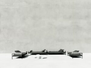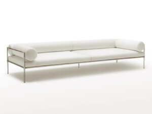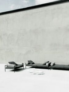 Sitzkissen und Polsterung der Rücken- und Armlehnen, gepolstert mit Polyurethanschaum mit offener Zellstruktur DRYFEEL S und Fasern für den Aussenbereich, bezogen mit wasserdichtem, heissversiegeltem Stoff. Polsterung nur mit Outdoor-Gewebe, vollständig abnehmbar durch Reissverschlüsse