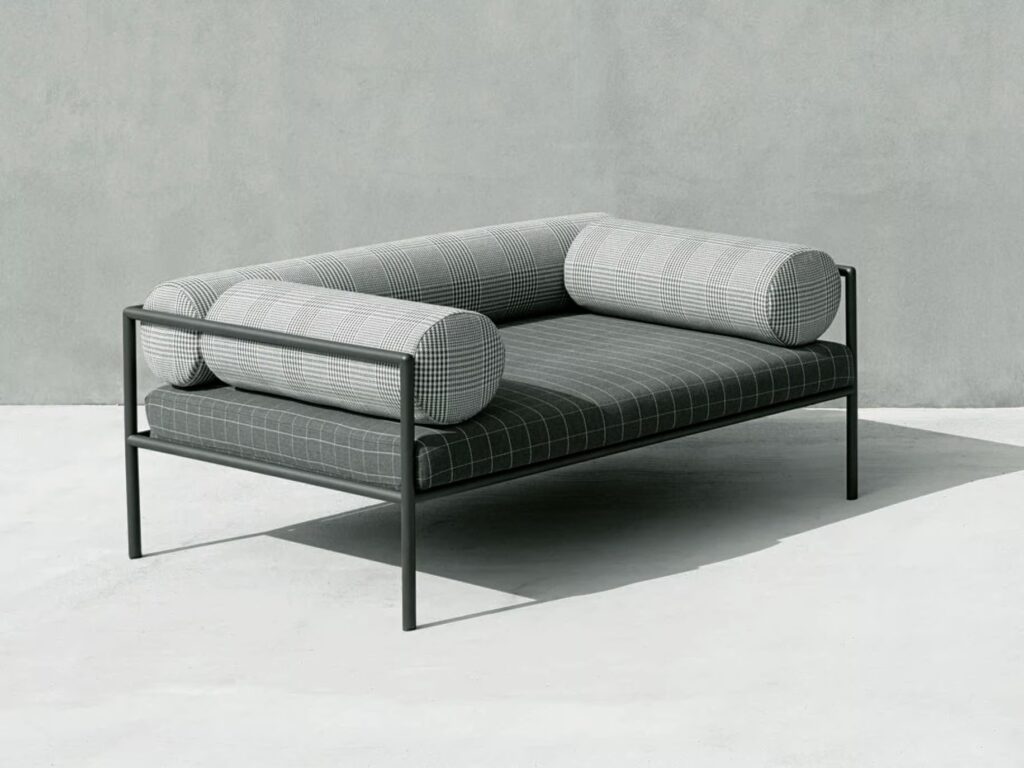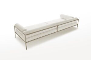 Outdoor-Version: Rohrrahmen Ø25mm aus Edelstahl AISI 316 mit matt satinierter Oberfläche oder Edelstahl AISI 316 mit Epoxid-Polyester-Pulverbeschichtung in Rotgussgrau, mit gewachstem Seil (Ø5mm) in den in der Kollektion erhältlichen Ausführungen geflochten. Mit dem Rahmen verschraubtes Sitzgestell aus Edelstahl 40x30mm, gefedert mit beschichteten Gummibändern, mit Edelstahlhaken. Polsterung aus Polyurethanschaum mit offener Zellstruktur DRYFEEL S, beschichtet mit wasserabweisendem Stoff für den Aussenbereich.