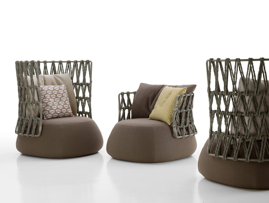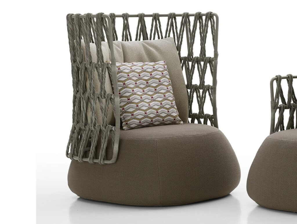 Die abgerundeten, weichen und geschwungenen Formen des Fat-Sofa-Sitzsystems bilden die Grundlage für die neue Version für den Außenbereich, die sich durch ein ganz neues Geflechtdesign auszeichnet. Die vollständig gepolsterte Sitzfläche wird von einer Rückenlehne mit Metallrahmen begleitet, die das ursprüngliche Geflecht unterstützt und ein besonderes Spiel aus Fülle und Leere erzeugt. Das großflächige Flechtmuster aus schildpattfarbenen, gedrehten Polyethylenfasern macht das Design einzigartig und respektiert die Idee des Designers von Leichtigkeit und Transparenz und stellt die Möbel in einen offenen "Dialog" mit der Umgebung. Fat-Sofa Outdoor besteht aus sechs Typen, vom linearen Sofa (230 cm) bis zur großen Relax-Insel, von zwei Höhenvarianten des Sessels bis zu einer Reihe von Ottomanen in verschiedenen Größen. Die neue Stoffkollektion, die auch für die großen Rückenkissen erhältlich ist, schafft stimmungsvolle Farb- und Sichtkombinationen.