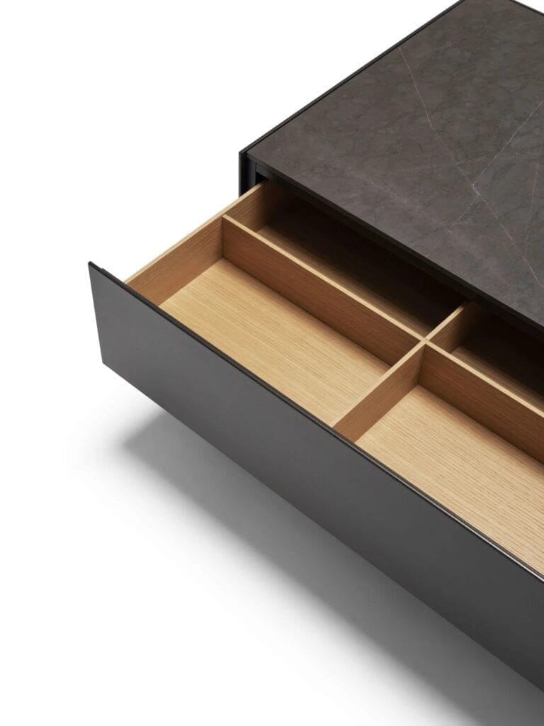 Ablageplatten: Marmorplatte aus grauem (matt), Statuarietto- oder Marquina-Marmor (mit natürlicher Oberfläche oder poliertem oder satiniertem Polyester). Aussenstruktur und Schubladenfronten: Paneel lackiert in Charcoal, Light Grey, Teal. Sichtbare Holzteile, Innenschubladen und Tablett: Eiche Natur. Die Füsse sind verstellbar. Schubladen mit Soft-Close und Slow-Motion, mit Struktur aus furnierten technischen Paneelen.