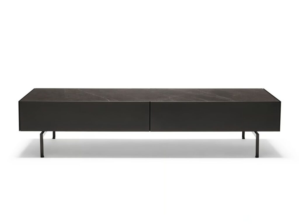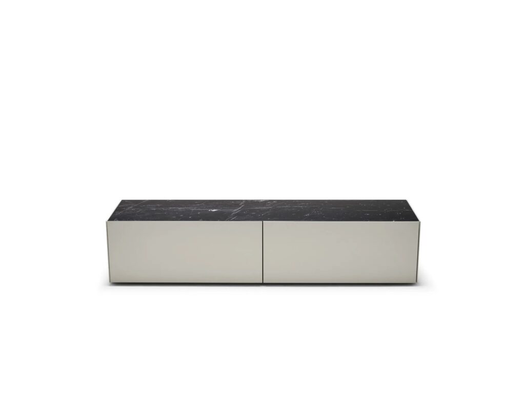 Die Credenzas und Stauraummöbel in ihren verschiedenen Konfigurationen zeichnen sich durch klare, strenge Volumen und Materialien von höchster Qualität aus. Alle Möbel sind mit einer Aussenstruktur in drei Farben - Teal, Anthrazit und Hellgrau - und mit Platten aus grauem, Statuarietto- oder Marquina-Marmor erhältlich.