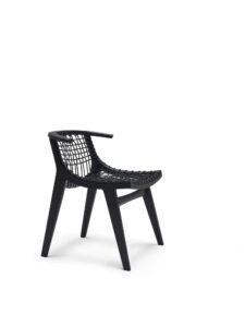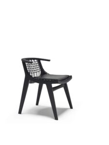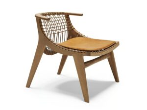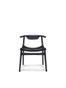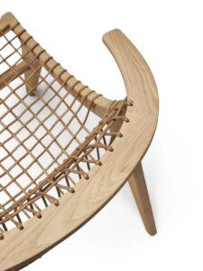 Das Gestell ist in Eiche natur oder schwarz. Verflochtene Baumwollschnur in Natur oder Schwarz, passend zur Farbe des Gestells. Das Kissen ist wahlweise in naturfarbenem oder schwarzem Leder erhältlich. Die Polsterung der optionalen Kissen ist aus natürlichem Material pflanzlichen Ursprungs.