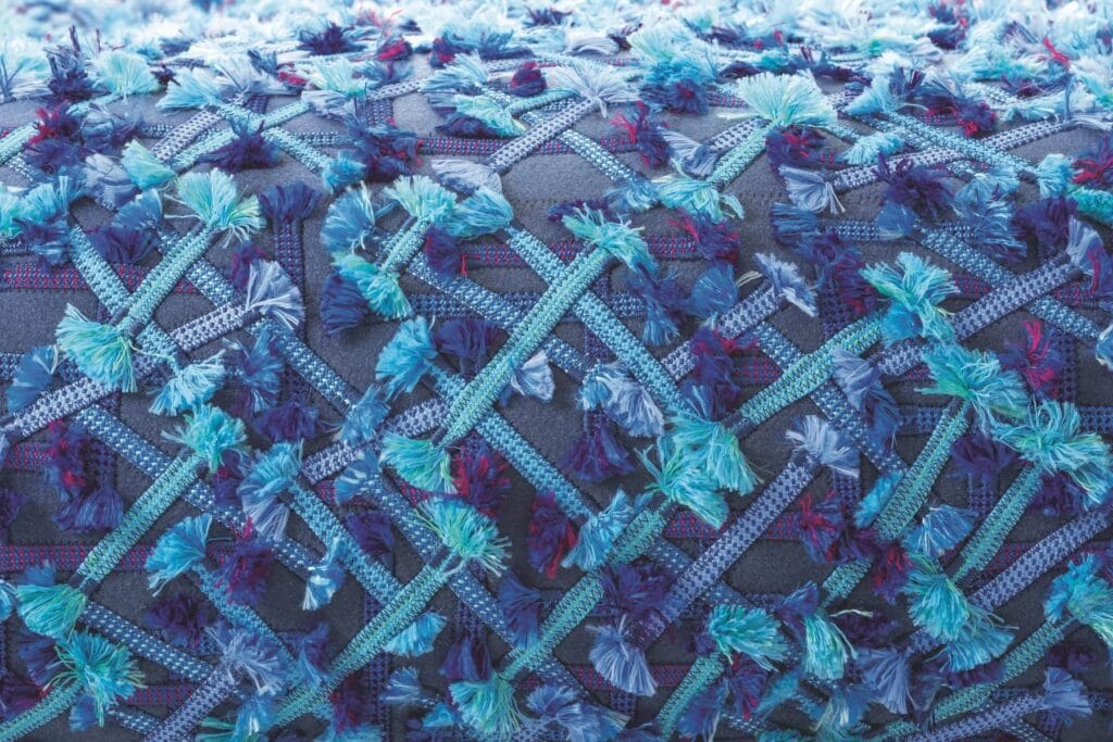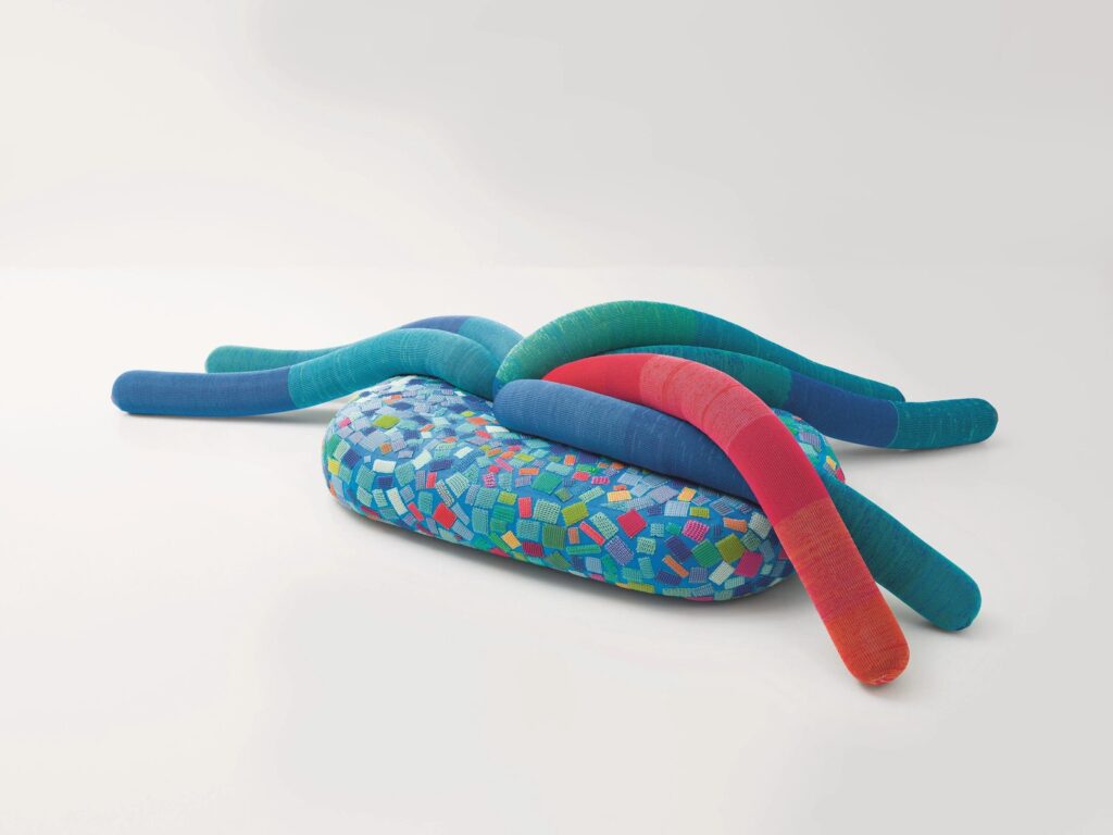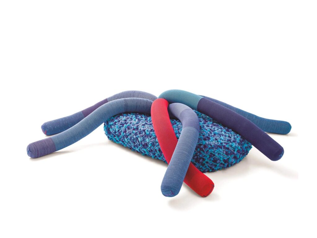 Der große informelle Sitz Metamorfosi Alicia verfügt über eine Rückenlehne, die aus beweglichen zylindrischen Elementen besteht, die von den Tentakeln der Alicia Mirabilis inspiriert sind, einer für das Mittelmeer charakteristischen Art, die sich nachts in einem visuell beeindruckenden Naturschauspiel bis zu mehreren Metern in die Höhe ausdehnt. Die Polsterung besteht aus einer Mischung aus recycelbarem Polyethylenschaum und recycelten Polyesterfasern. Der äußere Sitzbezug ist abnehmbar und besteht aus einem synthetischen Filz, auf den ein sich ständig veränderndes Muster aufgebracht ist. Die Rückenlehnenpolsterung aus Shaved Mesh ist fest und wird aus Polyesterfasern hergestellt, die beim Weben von Kollektionspolstern übrig bleiben und zu einem schlauchförmigen, elastischen Gestrick verarbeitet werden.