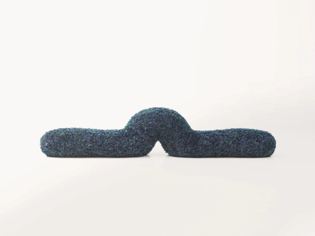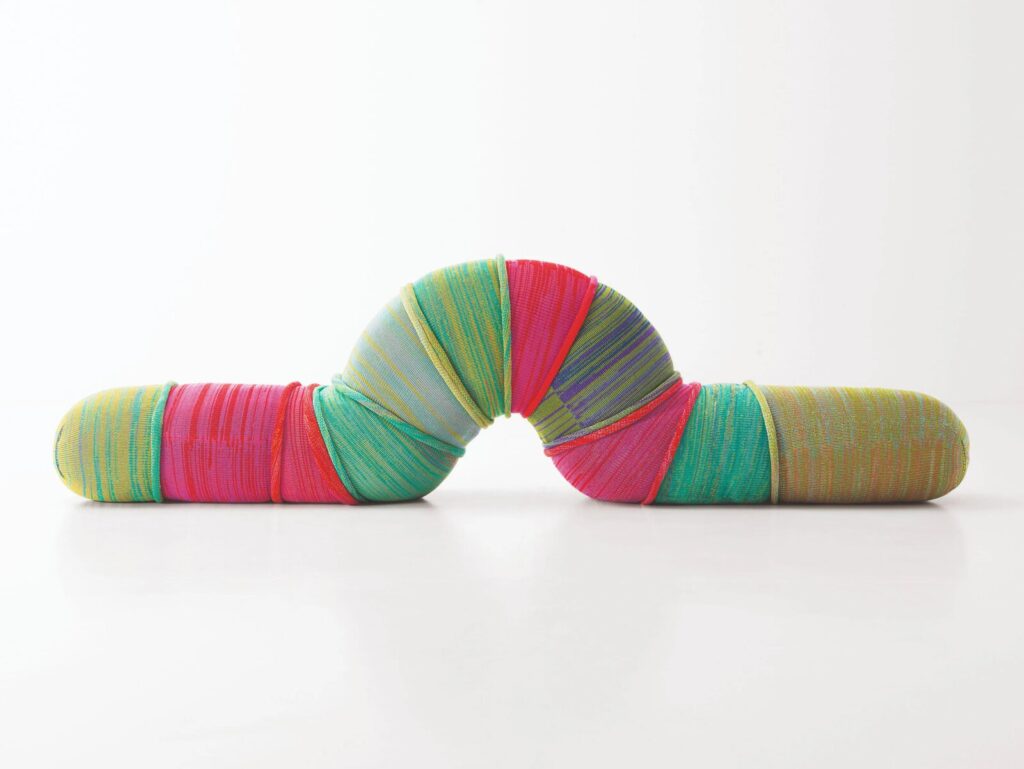 METAMORFOSI CENTOPEIA ist ein Sitz mit einem gewundenen Profil, wie eine der vielen verschiedenen Positionen, die ein Tausendfüßler einnehmen kann. Die Polsterung besteht aus einer Mischung aus recycelbarem Polyethylenschaum und recycelten Polyesterfasern. Der äußere Bezug ist abnehmbar und besteht aus einem synthetischen Filz, auf den ein ständig wechselndes Muster aufgebracht wird, oder aus Maglia Rasata, einem schlauchförmigen elastischen Gestrick, das aus der Rückgewinnung von Polyestergarnen gewonnen wird, die beim Weben von Kollektionspolstern übrig bleiben. Centopeia ist ein Sitz, der in zwei Größen erhältlich ist.
