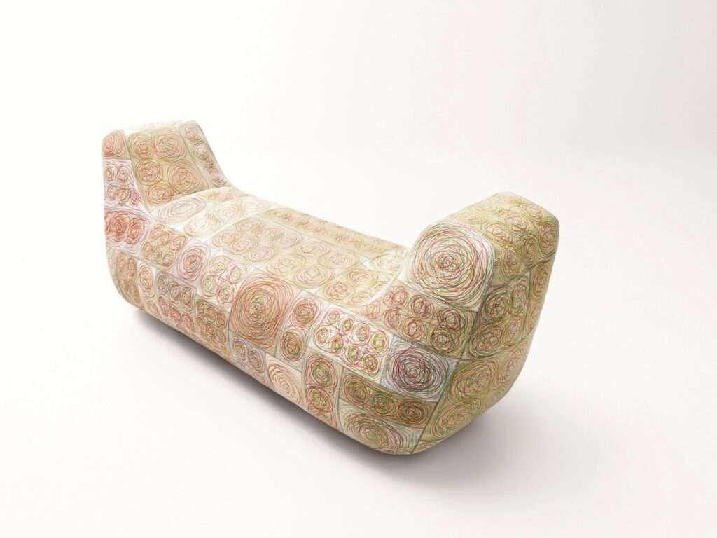 Der neue Bezug ist abnehmbar und besteht aus Zuschnitten aus Paola Lenti Filz, die im Punto-Zickzack-Stich zusammengenäht und anschließend mit Maschinenstickerei verziert werden. Die Stickerei folgt einem vorgegebenen Muster, das sich von Zeit zu Zeit leicht verändert, je nach den Bewegungen, die der Maschine vom Bediener aufgezwungen werden. Bruco ist in zwei Größen erhältlich.