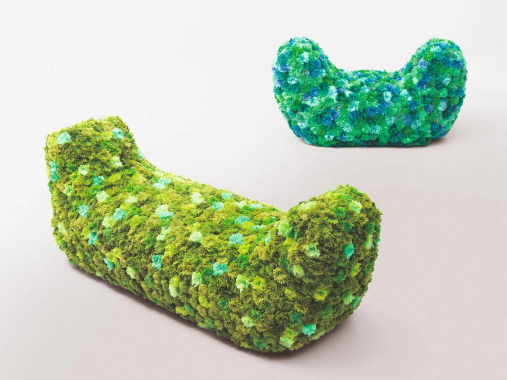 METAMORFOSI BRUCO ist ein Innensitz mit symmetrischen Seitenlehnen, inspiriert von der runden und länglichen Form der Raupe, die darauf wartet, sich in einen Schmetterling zu verwandeln. Die Polsterung besteht aus einer Mischung aus recycelbarem Polyethylenschaum und der recycelten Polyesterfaser Aerelle® blue.