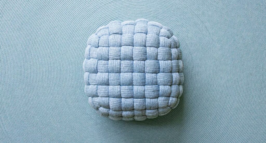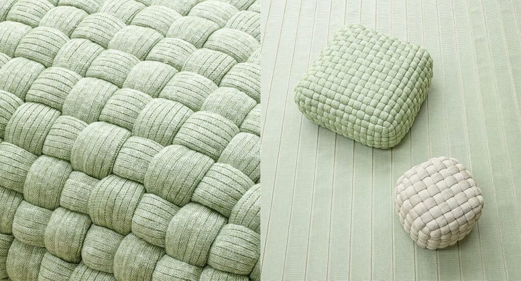 Serie von Hockern in verschiedenen Größen mit abnehmbarem Bezug aus handgeflochtenem Schlauchgewebe.