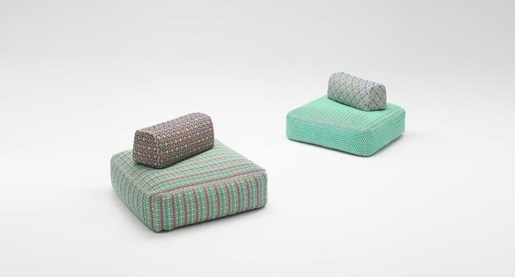 Bei der Polsterung aus sandfarbenem Kimia-Stoff wird dem Schaumstoffbezug aus dreidimensionalem Polyestergewebe ein weiterer Bezug aus farblich passendem Luz-Stoff hinzugefügt.