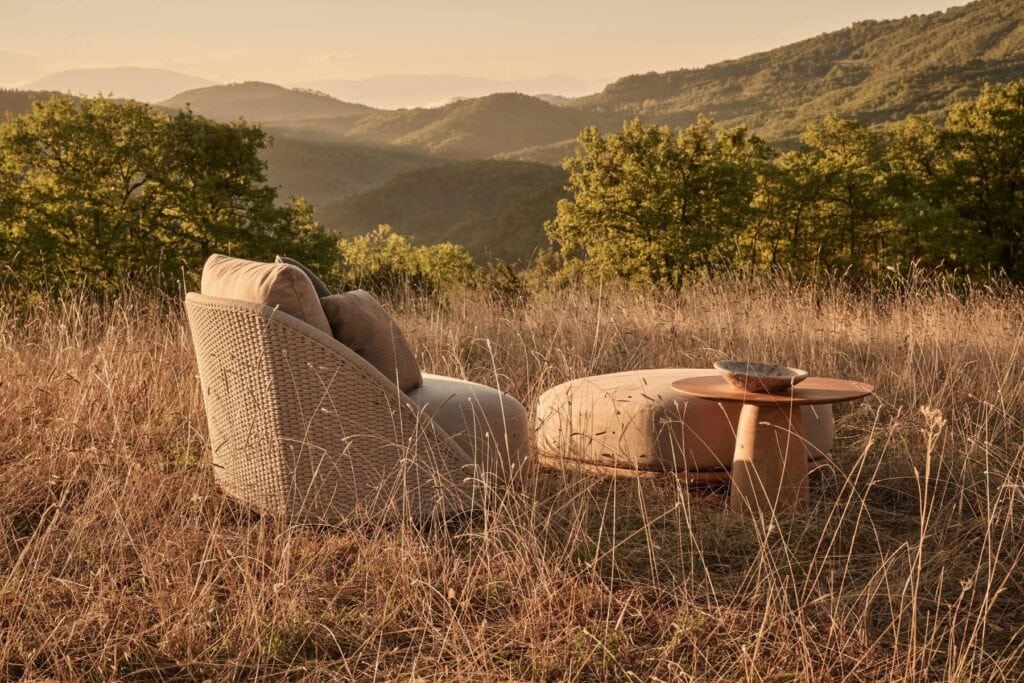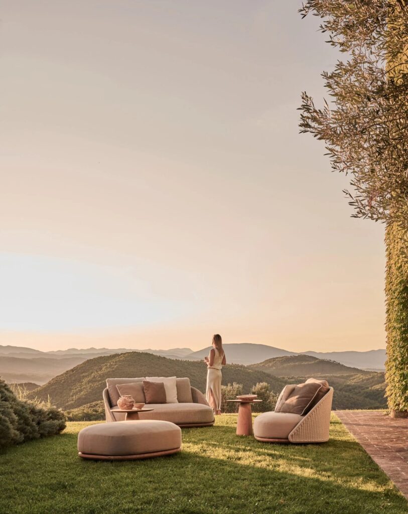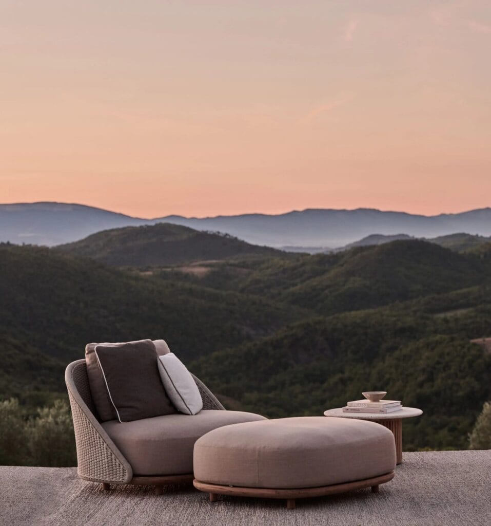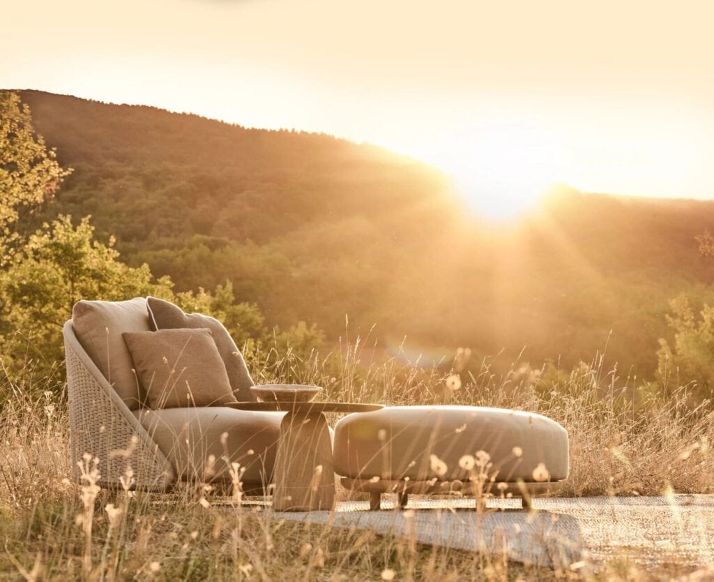 Elio hat eine weich abgerundete Silhouette, die sich nach innen zieht, um einen Kokon-Effekt zu erzeugen. Elio-Sessel, Easy-Sessel, Lounge-Sessel mit hoher Lehne und Zweisitzer werden von natürlichem Teakholz umrahmt, das die Sitzschale vor allem durch die hinteren Beine trägt. Die verschiedenen Sesselstile lassen sich harmonisch miteinander kombinieren und passen hervorragend zu unseren anderen Kollektionen.