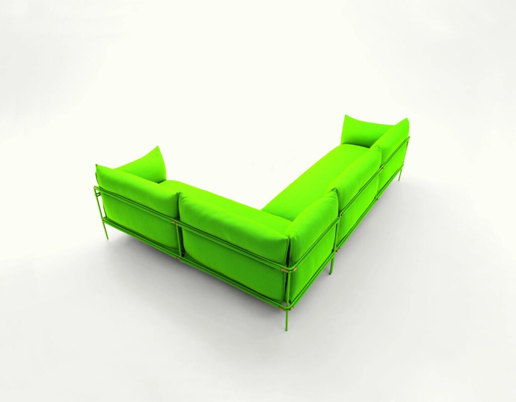 Kabà ist ein Sofa und ein Sektionalsitzmöbel. Die Sitzkissen, die Rückenlehnen und die Armlehnen sind an der Stahlstruktur mit Kernholzelementen befestigt, die leicht herausgenommen werden können, um die Bezüge zu entfernen. Zur Serie Kabà gehören auch ein Sessel und ein Pouf.