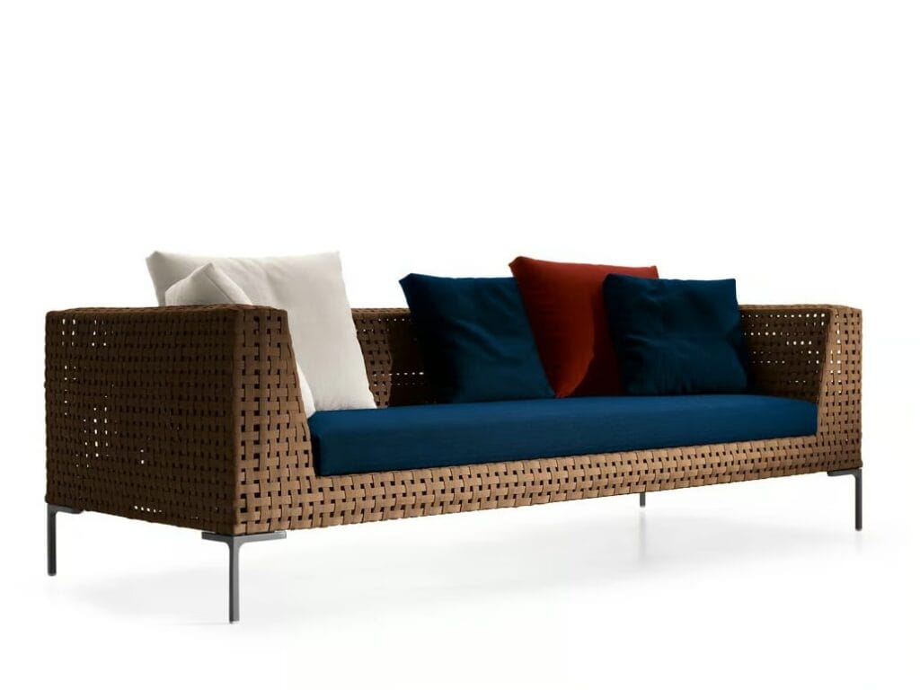 Das sofasystem Charles, ein best- und longseller der marke, ist jetzt auch in der neuen outdoor-version charles outdoor erhältlich. Die charakteristischen eigenschaften dieses modernen klassikers sind erhalten geblieben: das schlanke gestell, die flexibilität des systems und das schlichte design der aluminiumfüsse in form eines umgedrehten ''l''. Unter wahrung der schlichten und zeitlosen ästhetik des ursprünglichen entwurfs wird das volumen des unterbaus reduziert und durch ein leichtes aluminiumgestell ersetzt. Der korpus besteht aus einem offenen geflecht aus polyethylen bändern, mit regelmässigem und rechtwinkligem muster.