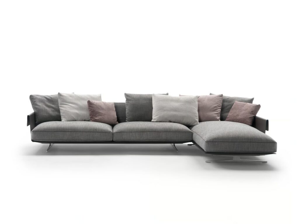 Das Sofa ruht auf einem eleganten Metallgestell, das ebenfalls mit Leder bezogen ist, während die Füße aus Aluminiumdruckguss ein strenges Design zeigen und in einer Vielzahl von raffinierten Ausführungen erhältlich sind.