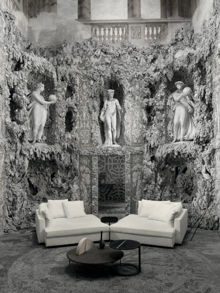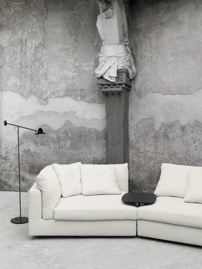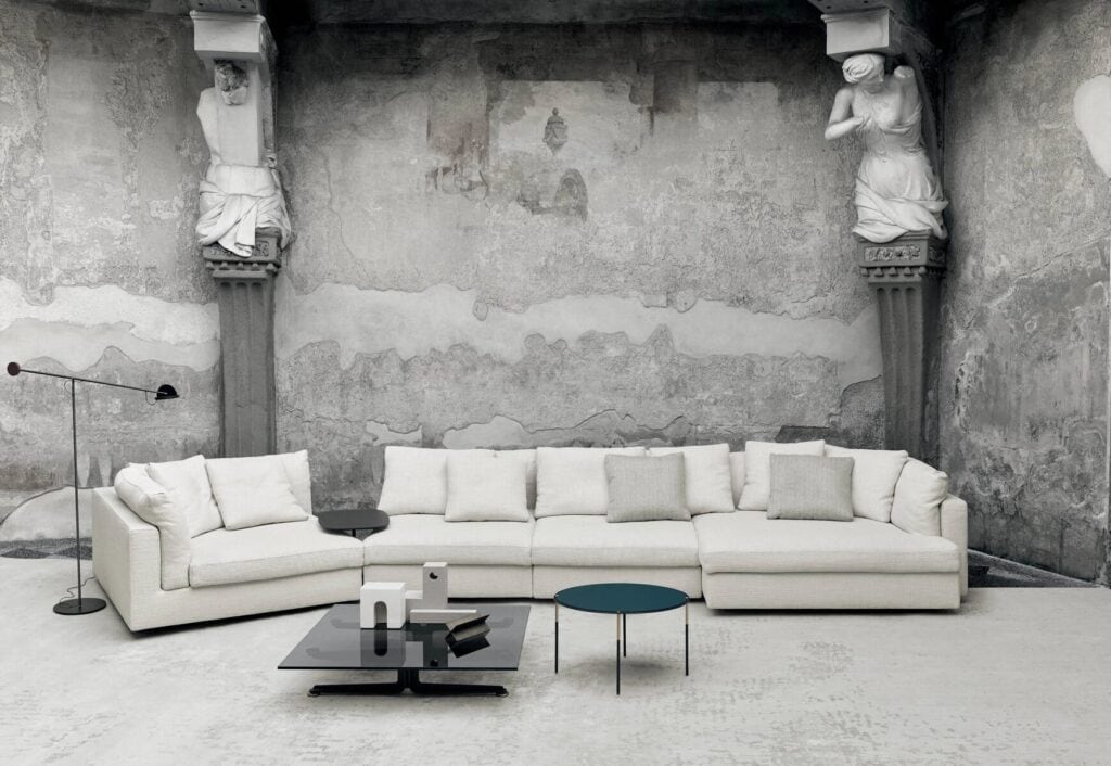 FLOYD sind modulare Elemente in verschiedenen Grössen mit einer Struktur aus doppelwandigem Pappel- und Tannenholz und einer Polsterung aus Polyurethanschaum mit unterschiedlicher Dichte. Das Gestell ist mit beschichteten Gummibändern gefedert und mit Polyurethanschaum gepolstert, der mit einer gestanzten und geharzten Polyestervliesfaser überzogen ist, die mit einem Polyamidsamtrücken verbunden ist. Rücken- und Armlehnenkissen aus vorgewaschenen und sterilisierten Gänsedaunen, in getrennten Fächern abgesteppt, mit Polyurethanschaumeinlage. Sitzkissen aus Polyurethanschaum mit differenzierter Dichte und