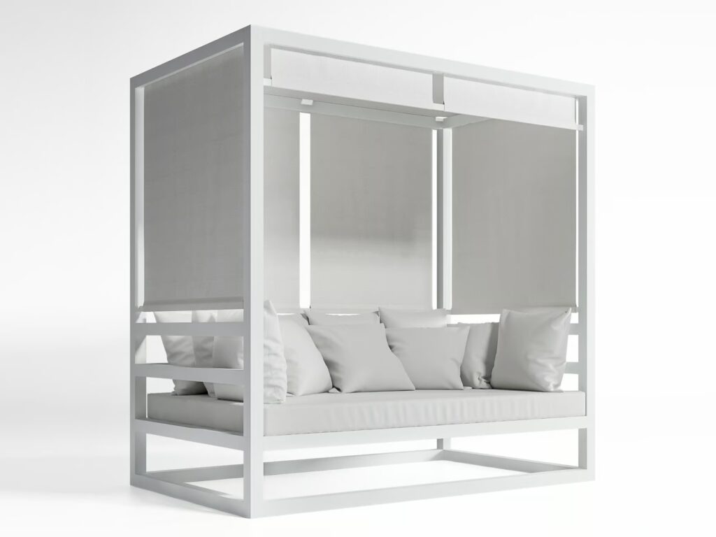 Hergestellt aus eloxierten oder thermolackierten Aluminiumprofilen und Synthetik-Stoffbahnen. Polyurethan-Schaumstoff mit einem wasserabweisendem Bezug. Bezug abziehbar.