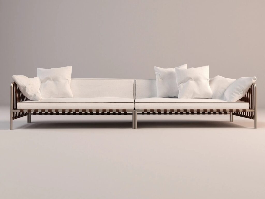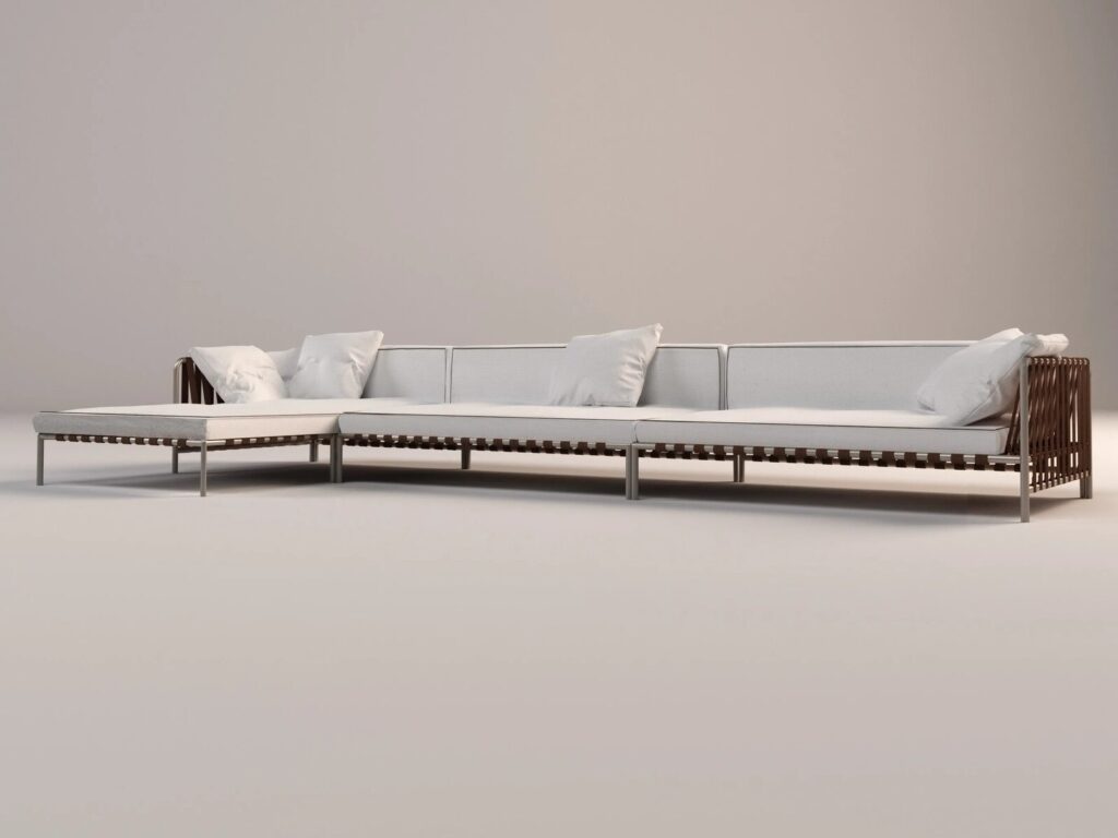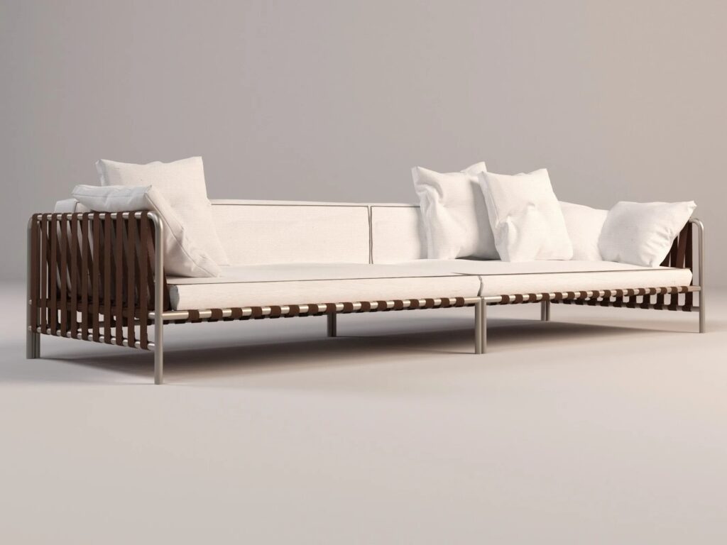 Einer der charakteristischen Aspekte der Kollektion ist, dass die Sitze und Rückenlehnen auf einer Reihe von Lederriemen ruhen, die miteinander verflochten und an einer Edelstahlrohrstruktur befestigt sind. Die grafische und ästhetische Komponente hat hier das gleiche Gewicht wie die technische Lösung: "Die Idee war, einen Kontrast zwischen dem Stoff und der Metallstruktur zu erzeugen, zusammen mit der Geometrie und der Transparenz, die die Bänder bieten", erklärt Meda.