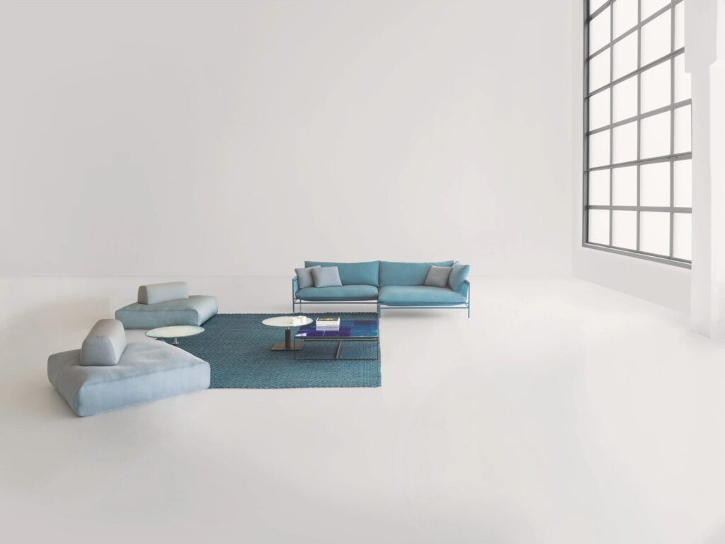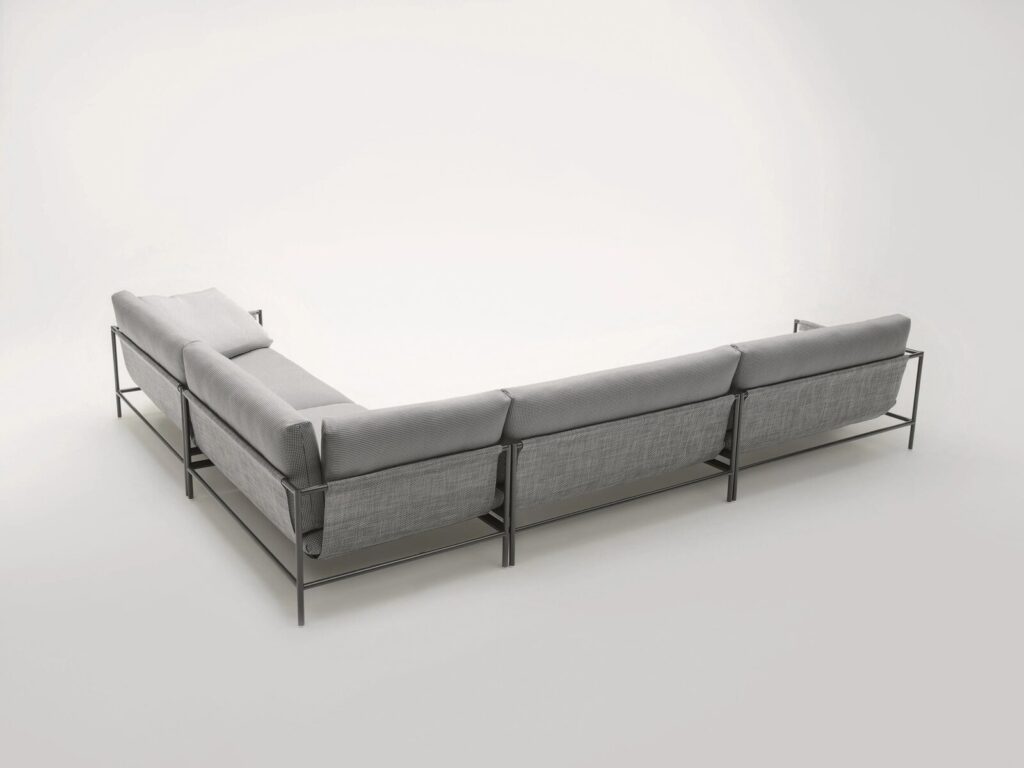 Diese Serie besteht aus modularen Elementen und einer Plattform, die mit einem tragfähigen Stoffbezug versehen ist.