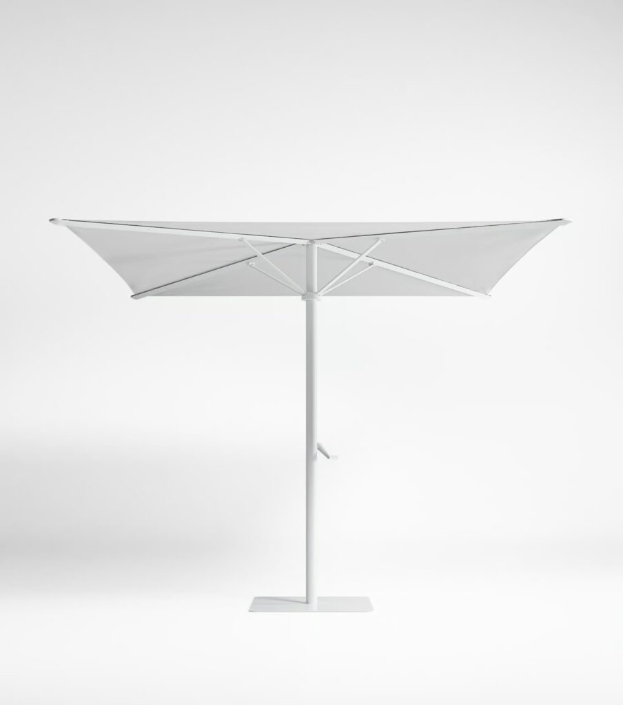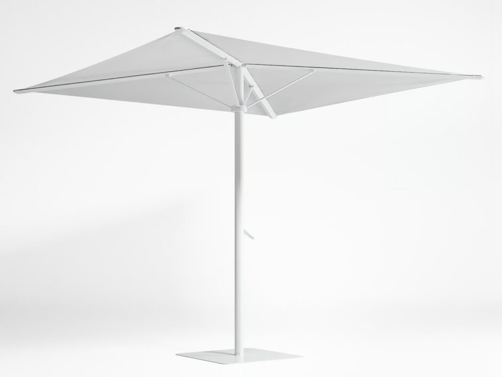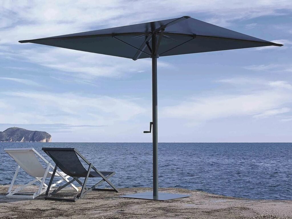 Klappbarer Sonnenschirm mit verzinkter thermolackierter Stahlbasis und thermolackiertem Aluminiumprofil. Aufziehen mittels Kurbel. Gegen UV widerstandsfähige Kunststoffplane.