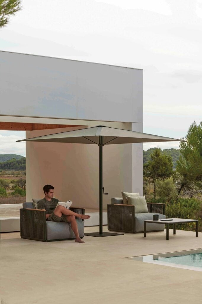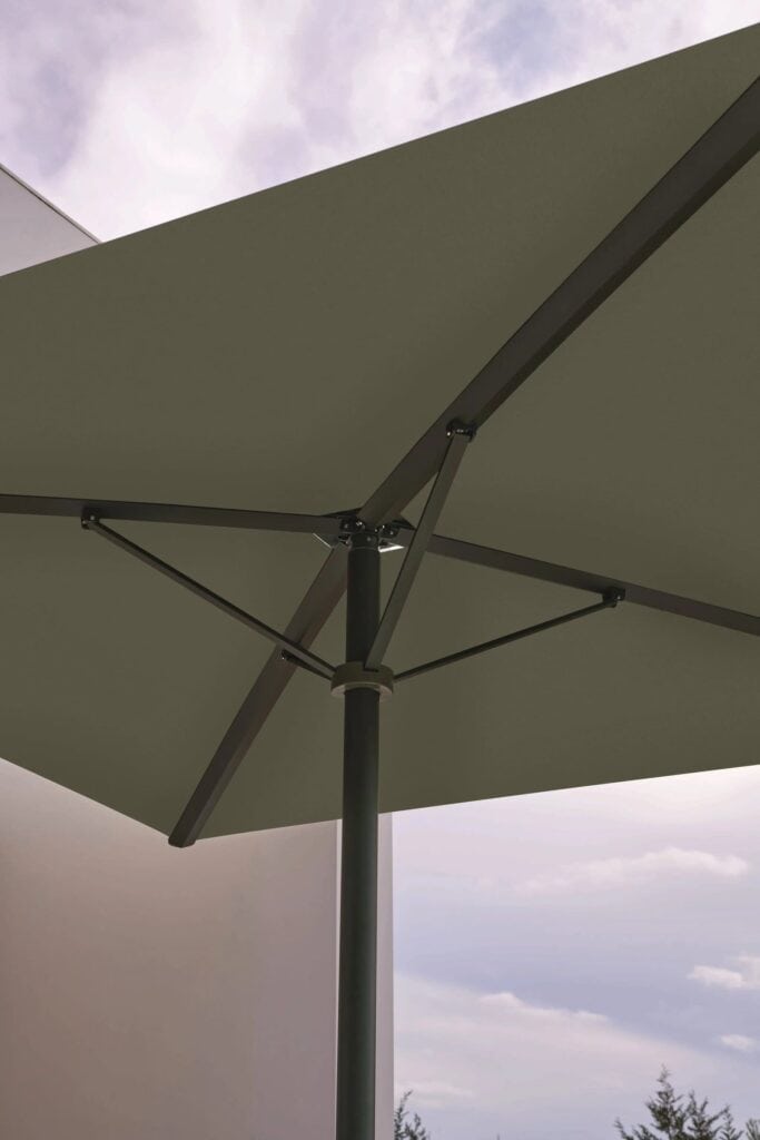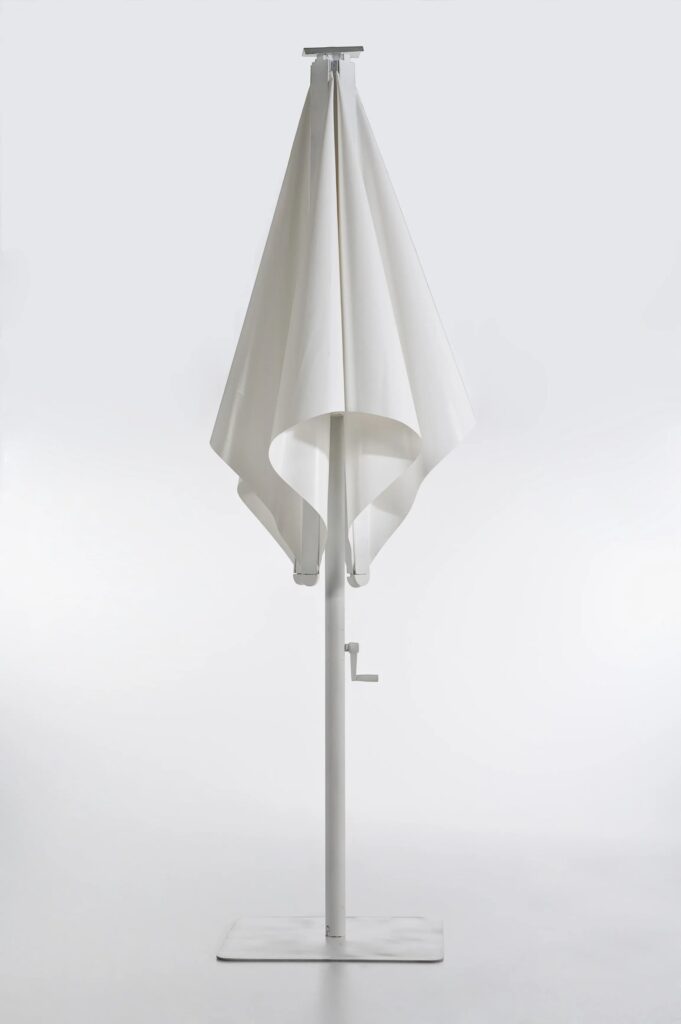Bali ist ein Sonnenschirm, welcher mit einem Regenschirmsystem funktioniert. Beim Design haben wir vor allem versucht, die Struktur und Funktionsweise, die andere Sonnenschirme verstecken, offenzulegen. Mit dieser Lösung können Endverarbeitung und Stofffarben kombiniert werden, sodass wir das Modell zweifarbig und einfarbig anbieten können. Das Endergebnis ist ein grossflächiger Sonnenschirm aus klaren Linien, der Dank seiner eingearbeiteten Handkurbel einfach zu öffnen und zu schliessen ist und sich dabei an den Benutzer anpasst.