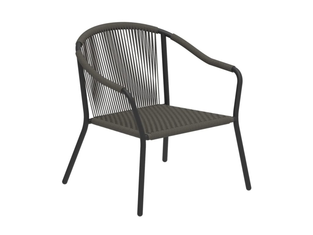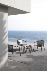 Der schlichte, aber bemerkenswerte Aluminium-Rohrrahmen ist mit einer Kombination aus gewebten Olefin-Seilen und Bändern umwickelt. QuickDry-Schaum ist in den Sitz integriert und sorgt für ein besonders weiches Gefühl! Der SAMBA ist als Tischstuhl und als niedriger Sessel erhältlich. Beide sind problemlos stapelbar. Ein passendes Set aus drei runden Beistelltischen aus Aluminium rundet das Bild ab.