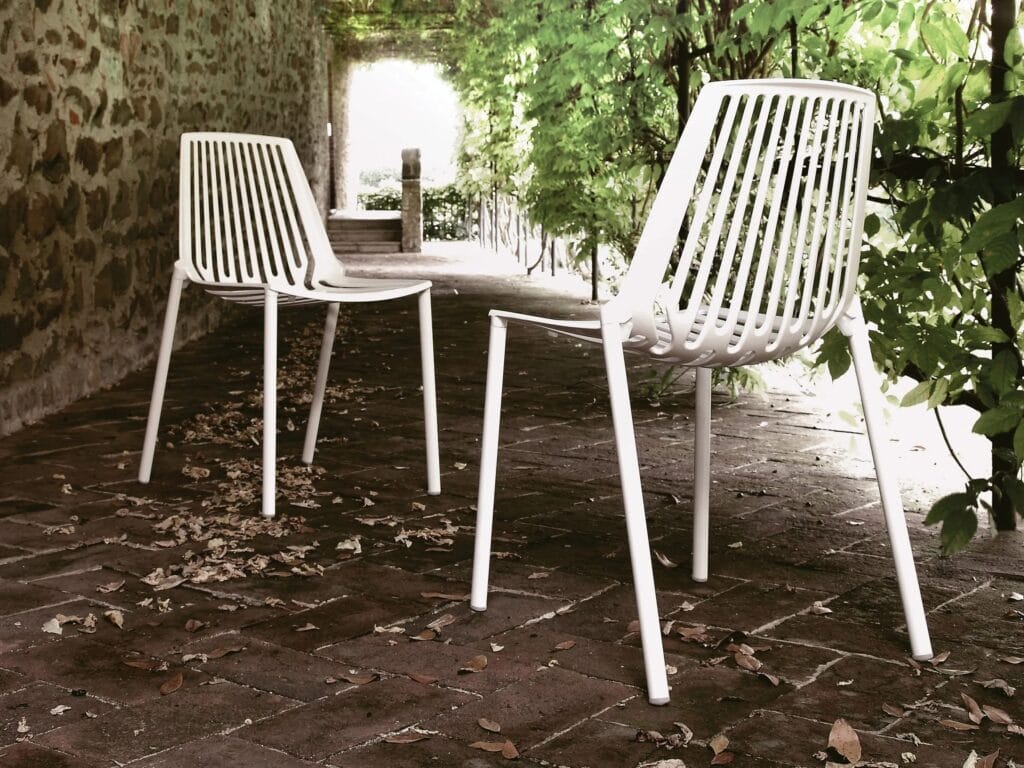 Omnia umfasst: Stühle, Stühle mit Armlehnen, Hocker, Tische und Couchtische für den Aussenbereich, Bänke, Liegen. Einige Modelle sind stapelbar und/oder können in Länge, Breite und Höhe individuell angepasst werden.