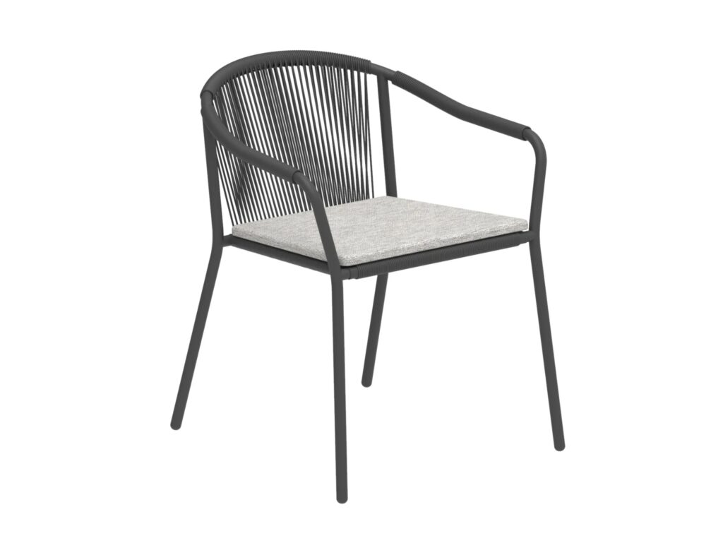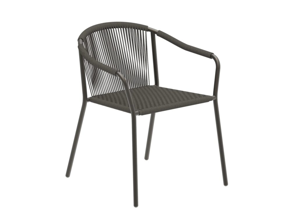 Samba ist ein stapelbarer Gartenstuhl aus Olefinfasern mit Armlehnen.