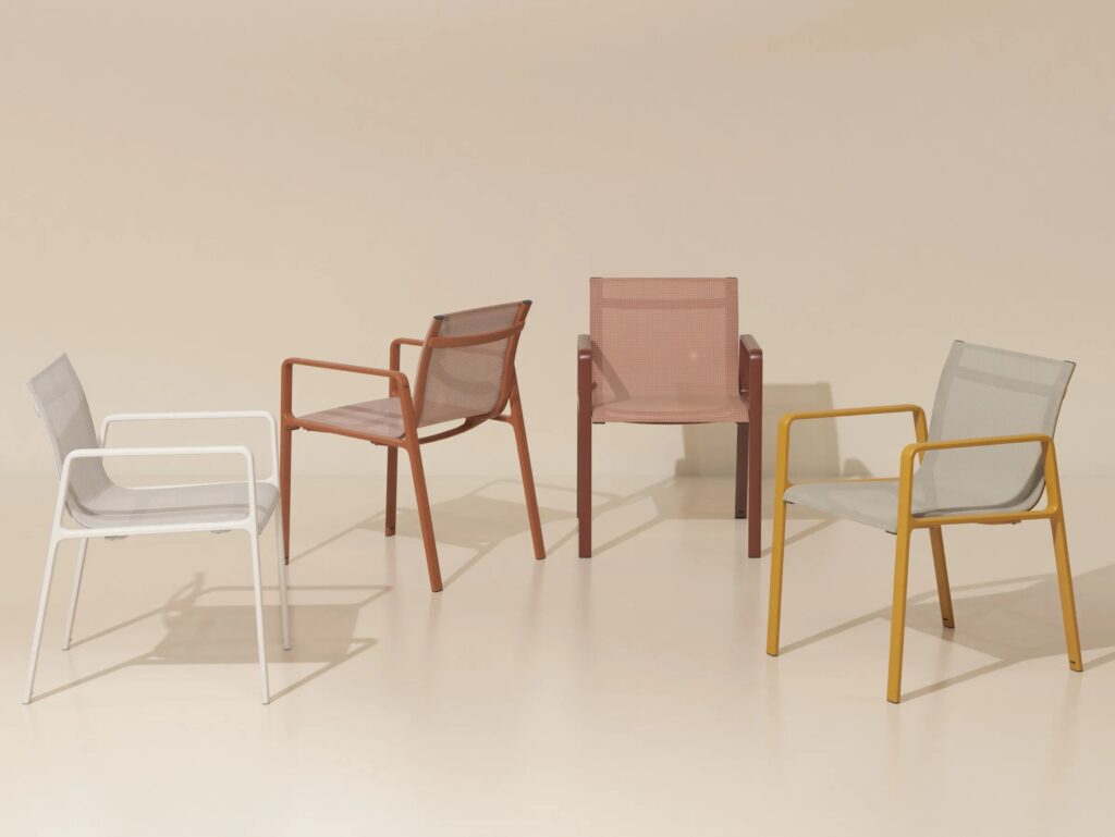 Stapelbarer Gartenstuhl aus Stoff mit Armlehnen