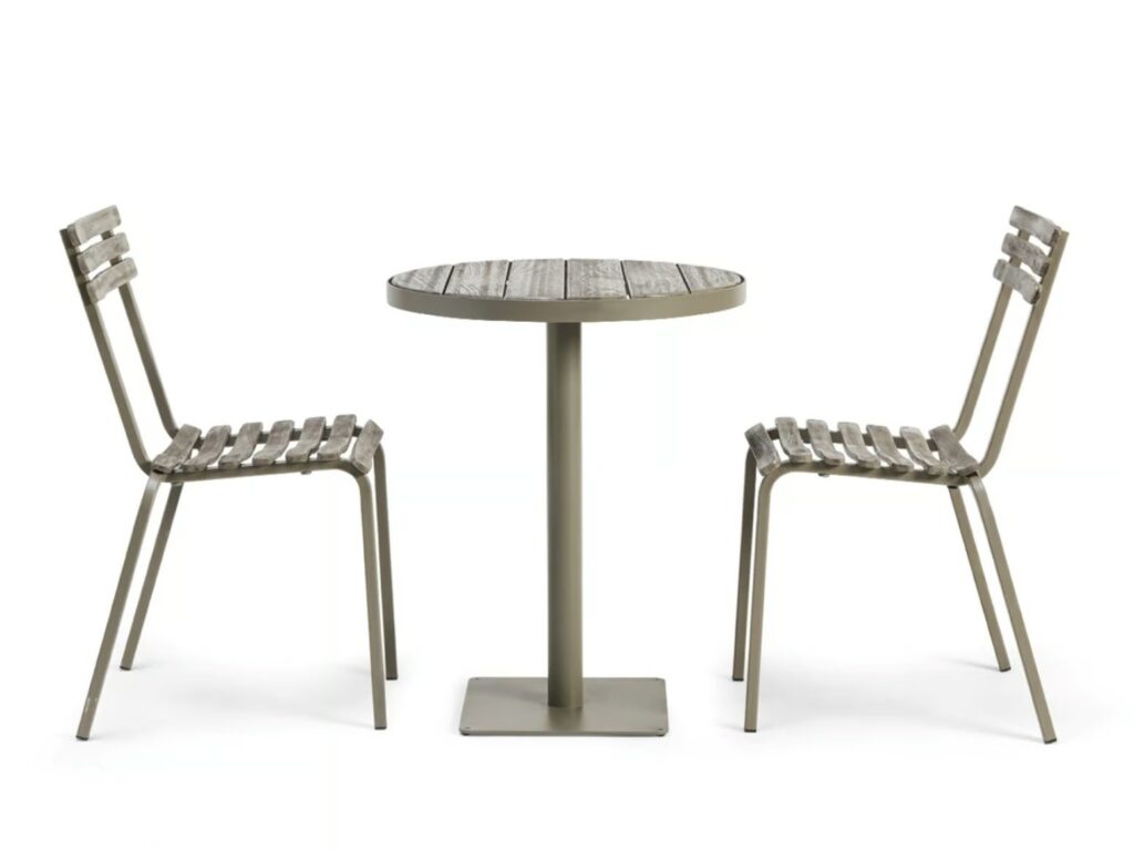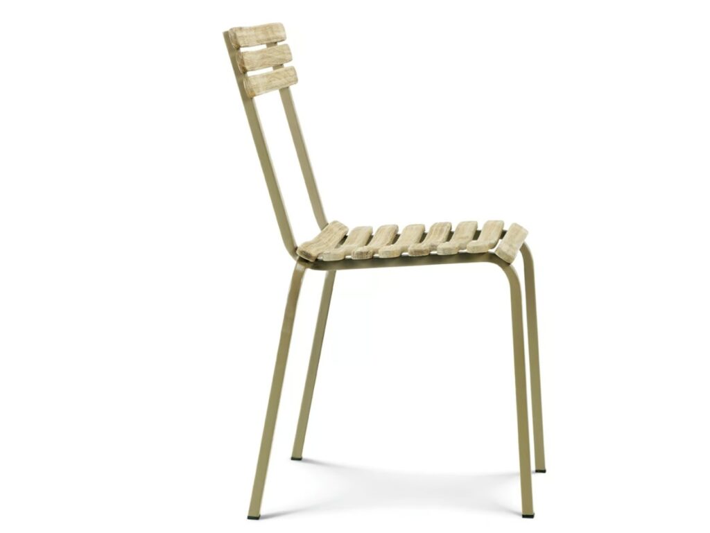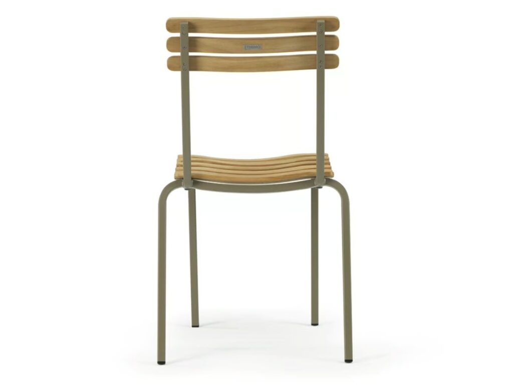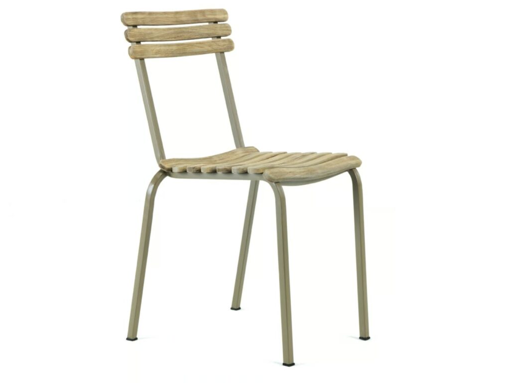 LAREN ist ein Stuhl aus Metall und gebeiztem Teakholz. Erhältlich in drei Versionen: stapelbar, klappbar, mit Armlehnen, hoher Hocker.