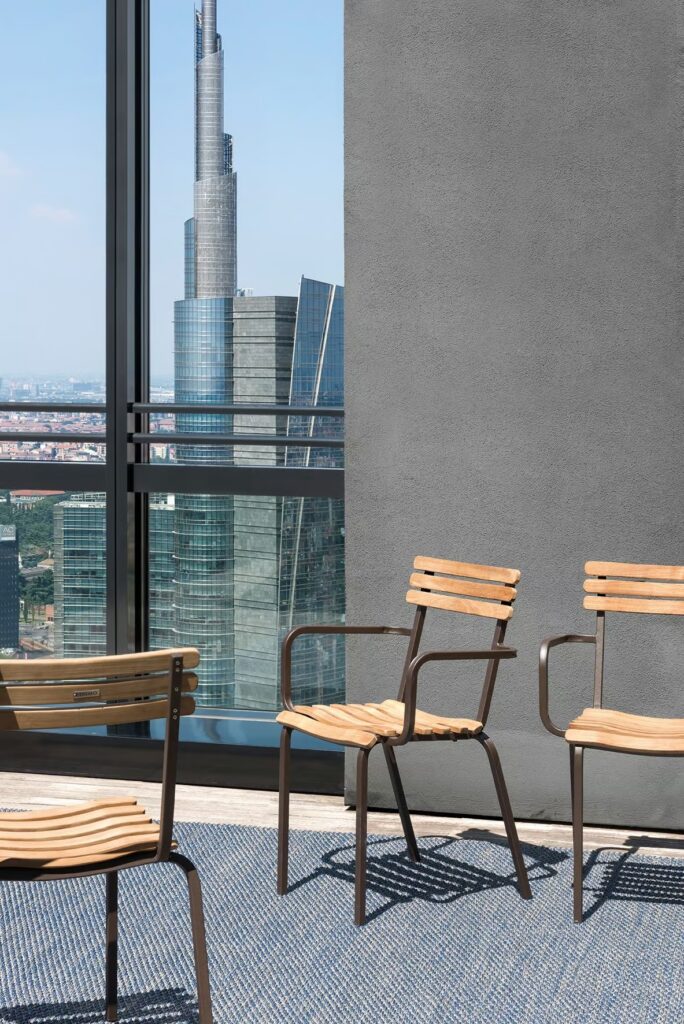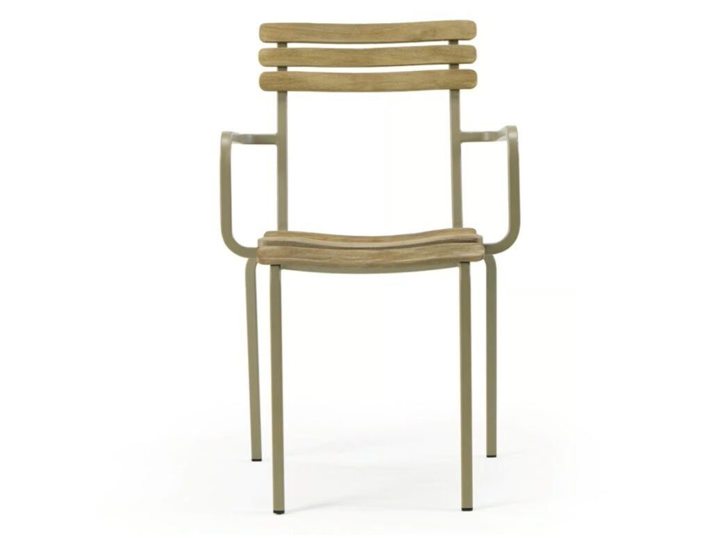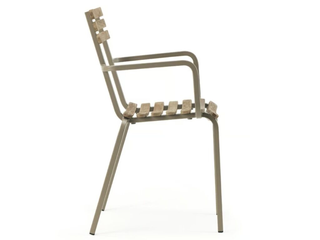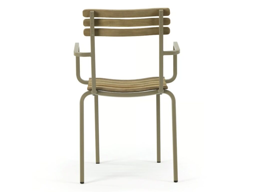 LAREN ist ein Stuhl aus Metall und gebeiztem Teakholz. Erhältlich in drei Versionen: stapelbar, klappbar, mit Armlehnen, hoher Hocker.