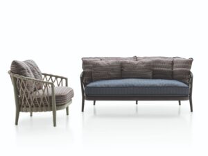 Die aus Sofas, Stühlen und Sesseln bestehende Kollektion Erica, 2017 mit großem Erfolg präsentiert, wird durch neue Sofamodelle ergänzt. Sie verfügen über die charakteristischen Merkmale der Serie, wie die gebogene Rückenlehne und das Flechtwerk, unterscheiden sich jedoch durch eine tiefere Sitzfläche und ihren “Used-Look”. Die Sofas sind in drei besonders komfortablen Größen erhältlich - 170 und 216 cm mit Sitz von 96 cm Tiefe und 153 cm mit Sitz von 140 cm Tiefe. Die Kissen sind mit einer neuen Polsterung versehen, die ihnen ein weiches und natürliches Aussehen verleiht, so dass sie zu echtem Relax einladen. Neu sind auch die Farbkombinationen: anthrazit, tortora für Gestell und Flechtwerk oder Gestell im Farbton salbei mit naturfarbenem Flechtwerk. Sie können mit einer breiten Auswahl an Kissenbezügen in zahlreichen Farbnuancen und Mustern kombiniert werden, die jeweils aufeinander abgestimmt sind. Vervollständigt wird die Serie durch einen Armstuhl, dessen Rückenlehne durch ein neues Flechtdesign besticht.