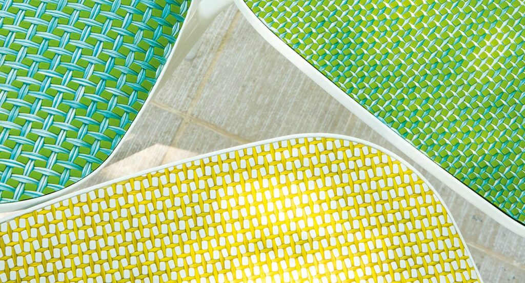 Sitz- und Rückenlehnenflächen: Diade, weißer, grüner oder hellblauer Hintergrund in Verbindung mit Tela-Gewebe.