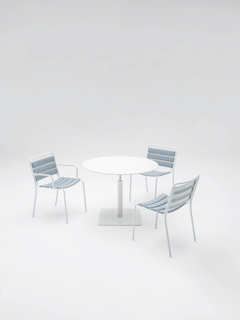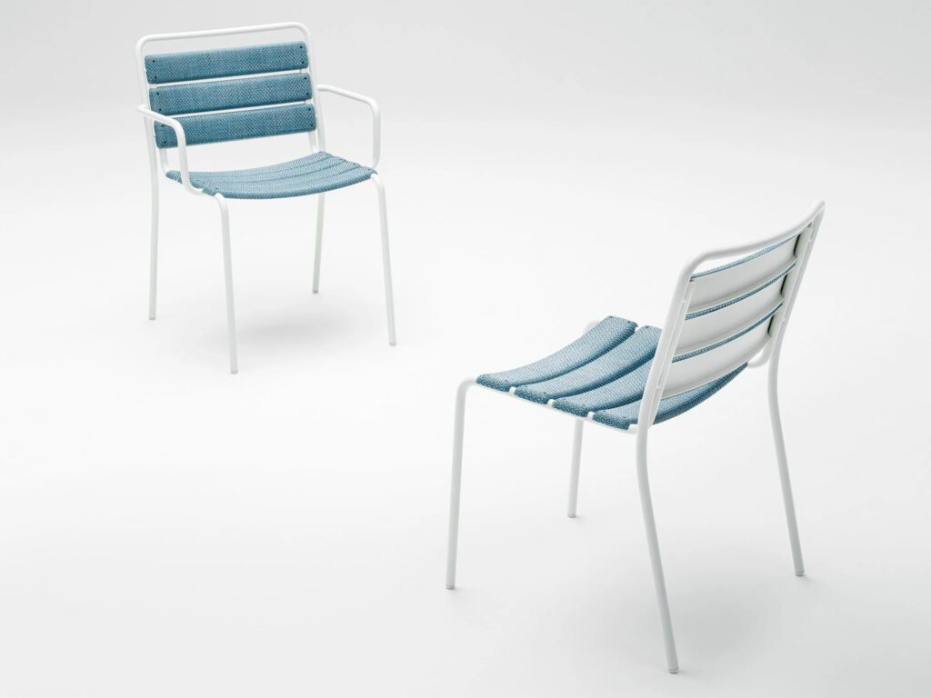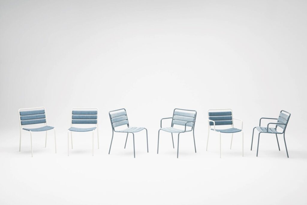 Der Stuhl Elba ohne Armlehnen, der Stuhl mit Armlehnen und der Barhocker können bis zu vier Stück gestapelt werden.