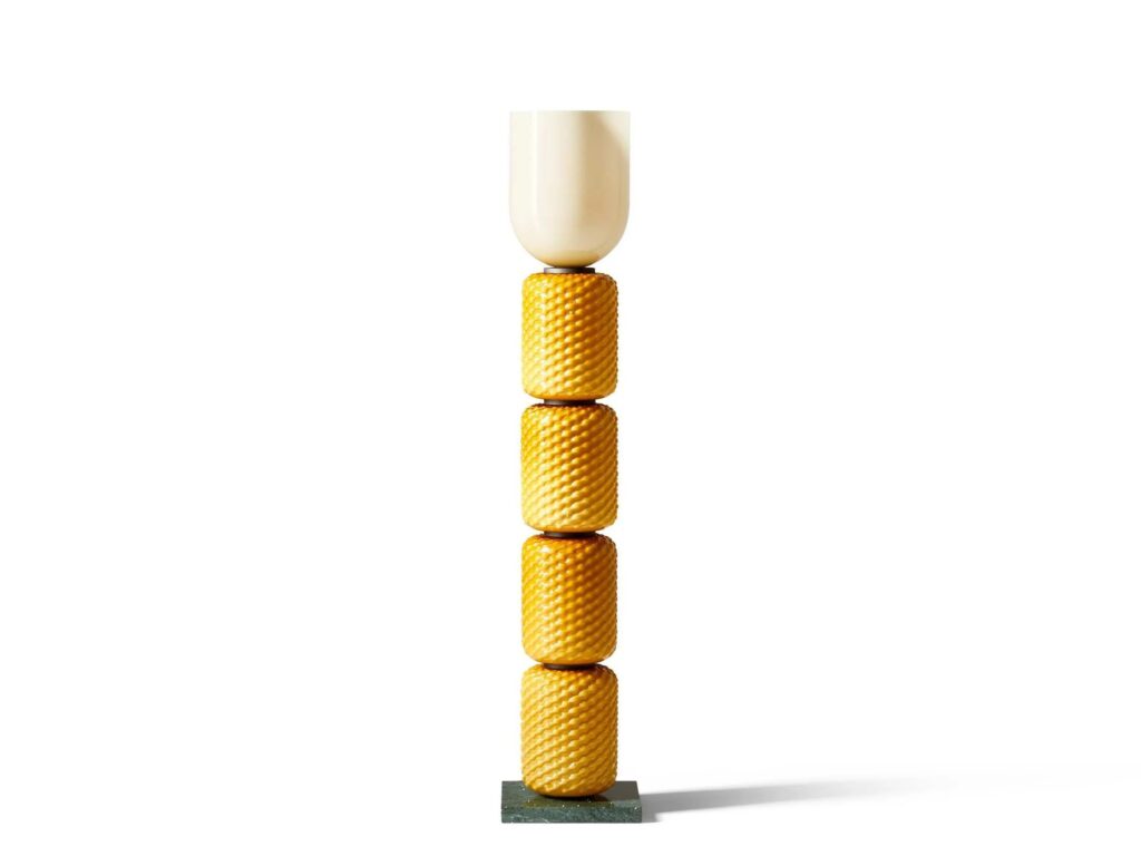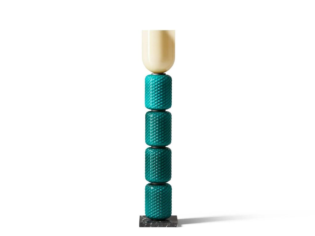 Die Designer-Leuchte Ficupala zeichnet sich durch ihren eklektischen Stil zwischen Postmoderne und Art déco aus, der sich an den organischen Formen aus dem Pflanzenreich inspiriert.