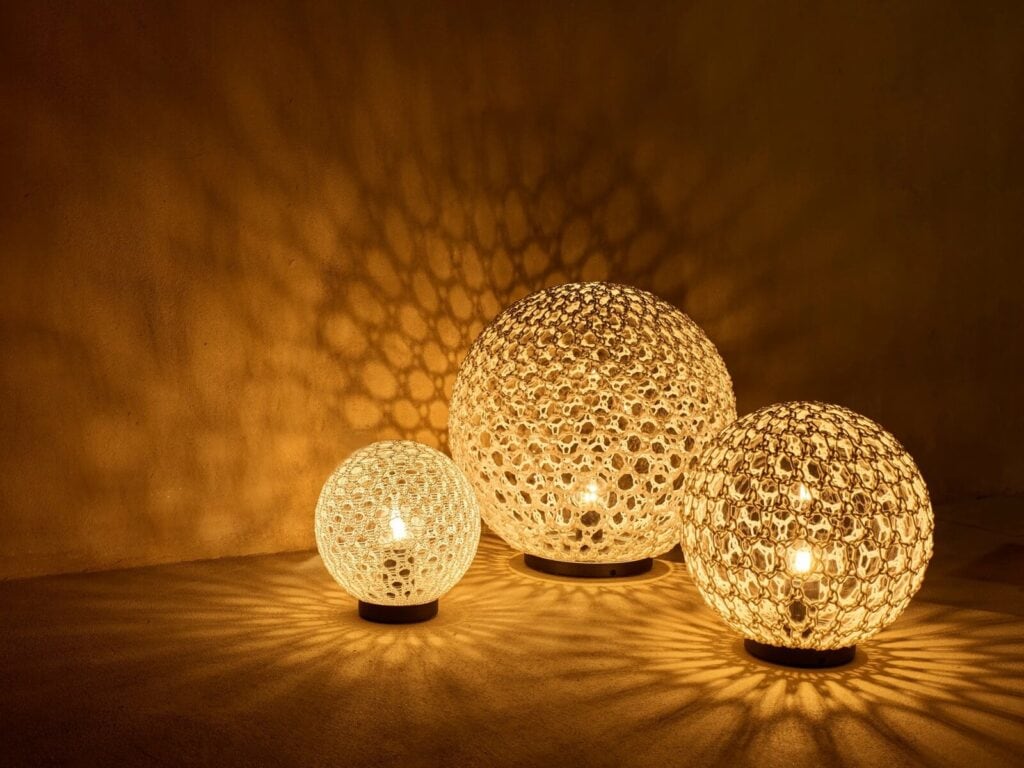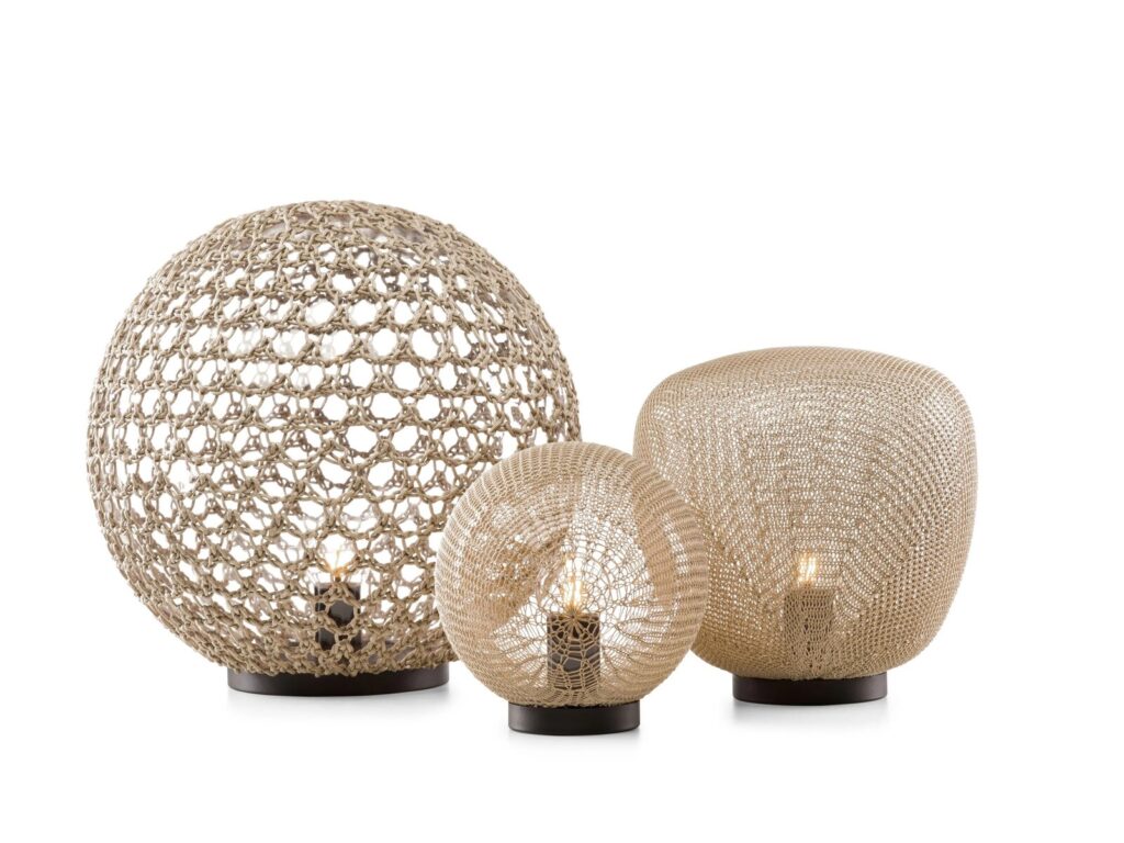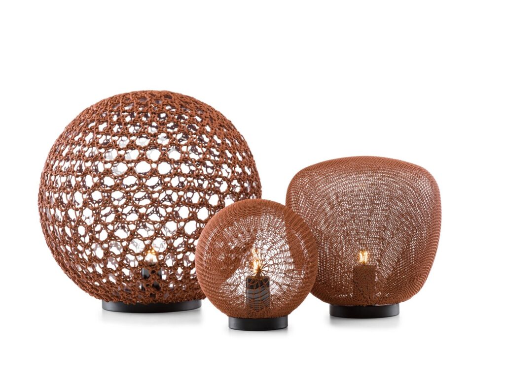Monsieur Tricot ist eine Kollektion markanter gestrickter Outdoor-Beleuchtungskörper. Der belgische Designer Ilia Eckardt wuchs in der belgischen Modeszene auf und experimentierte mit innovativen Stricktechniken und witterungsbeständiger Schnur. Seine handgefertigten Kugel- und Tropfenleuchten verströmen eine warme Glut und werfen wunderschöne Schatten. Die unterschiedlichen Formen, Texturen und Farben stellen die perfekte Ergänzung zu den Möbeln von Tribù dar.