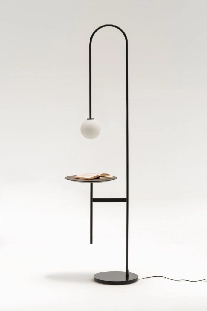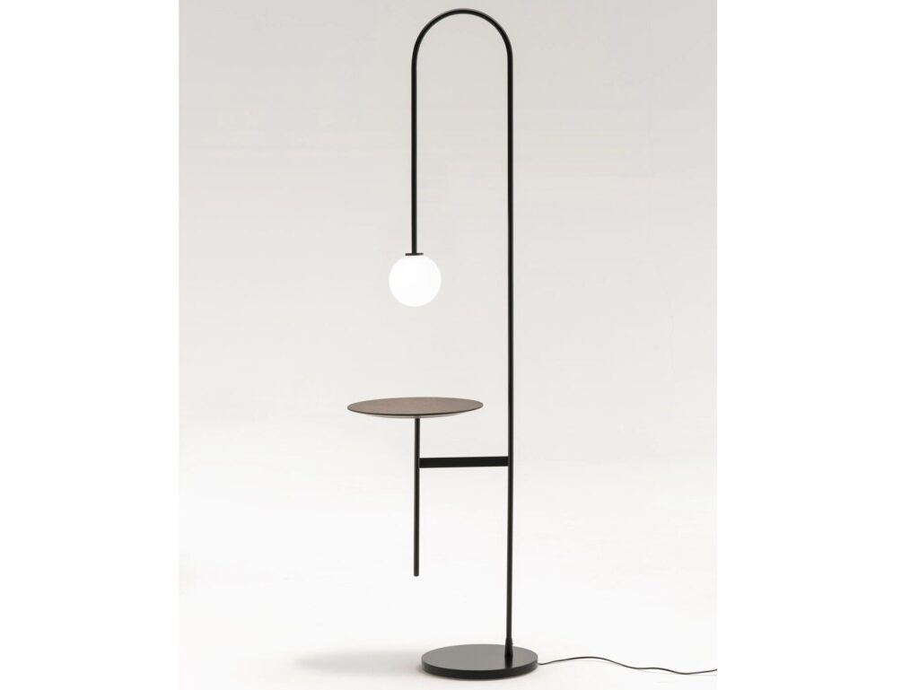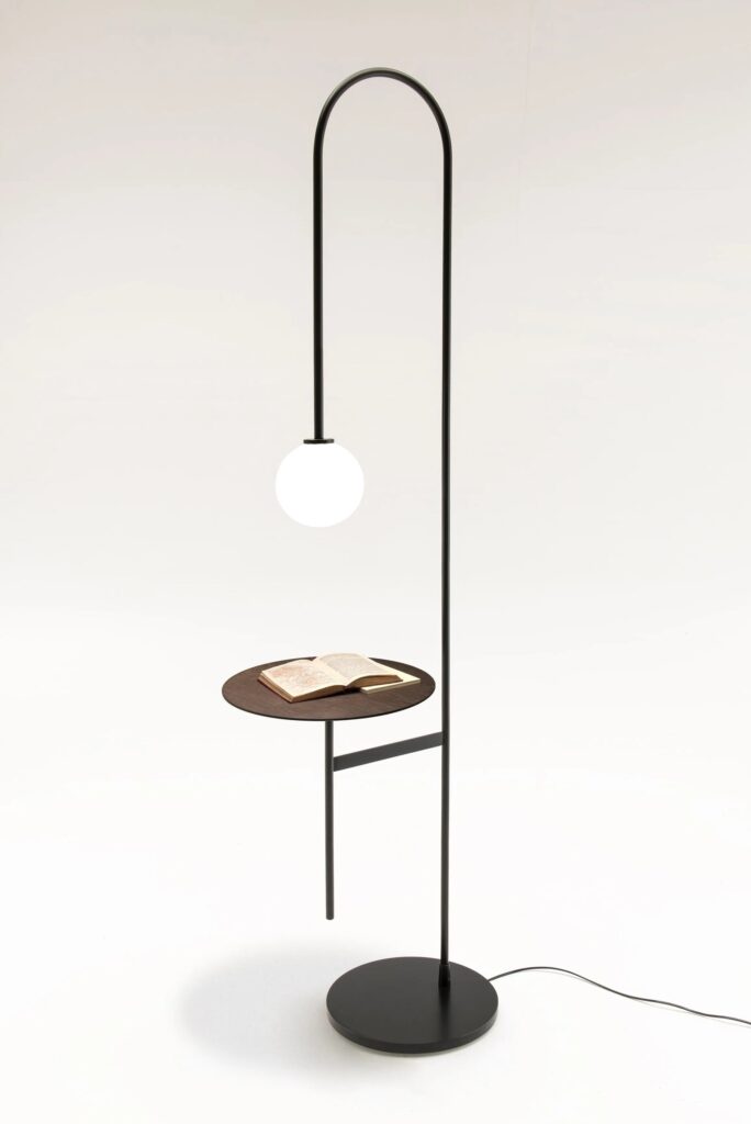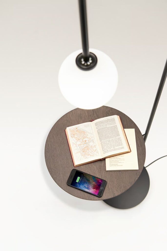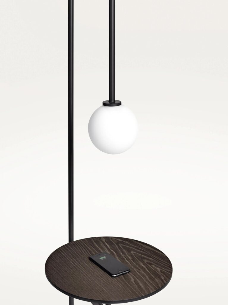 LIGHT WITH A TABLE ist eine Stehleuchte für den Innenbereich mit diffusem Licht und integriertem kleinen Tisch, der mit kabellosem Ladegerät und Touch-Lichtschalter ausgestattet ist. Struktur aus verschiedenen Stahlrohrprofilen mit Sockel aus 10 mm starkem lasergeschnittenem Stahlblech, kalandriertem Ring und Boden aus 3 mm starkem lasergeschnittenem Stahlblech, mit mattschwarzer Epoxid-Pulverbeschichtung. Im Sockel befindet sich ein Transformator zum kabellosen Aufladen und ein Netzteil zum Ein- und Ausschalten der Lampe.