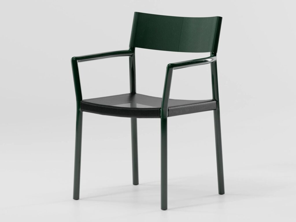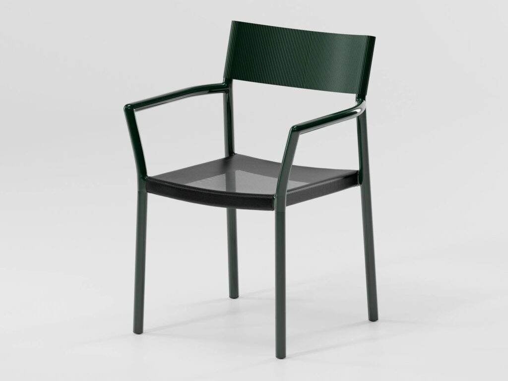 Passage ist ein Aluminiumstuhl mit Armlehnen und Sitz aus Textilene.