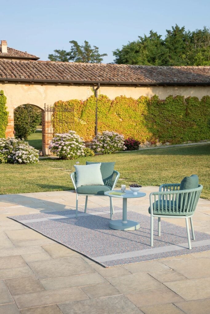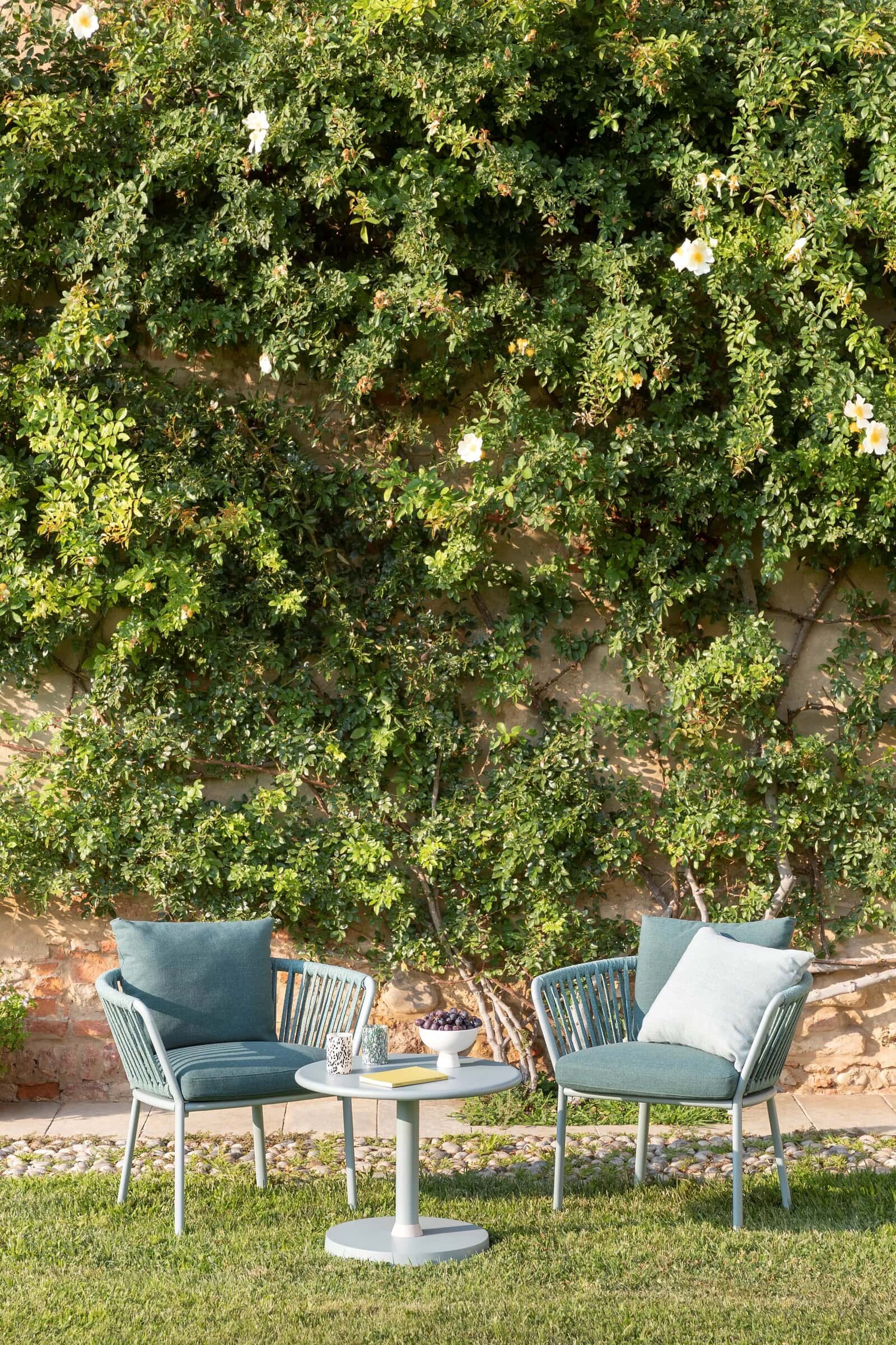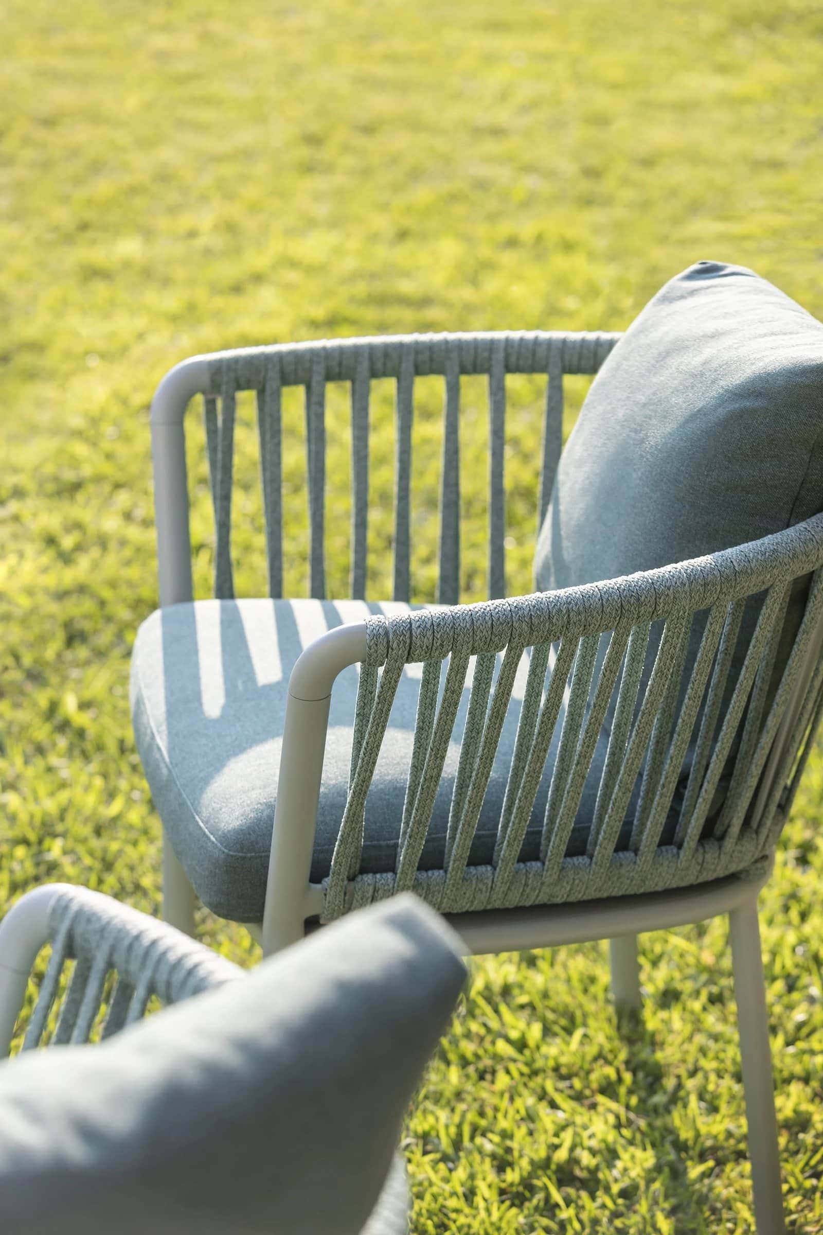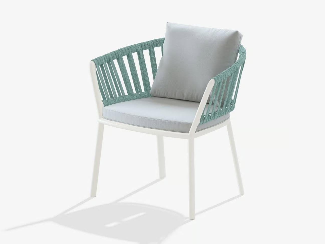 Ria ist ein lackierter Aluminium-Gartenstuhl mit Vollgeflecht und integriertem Kissen.