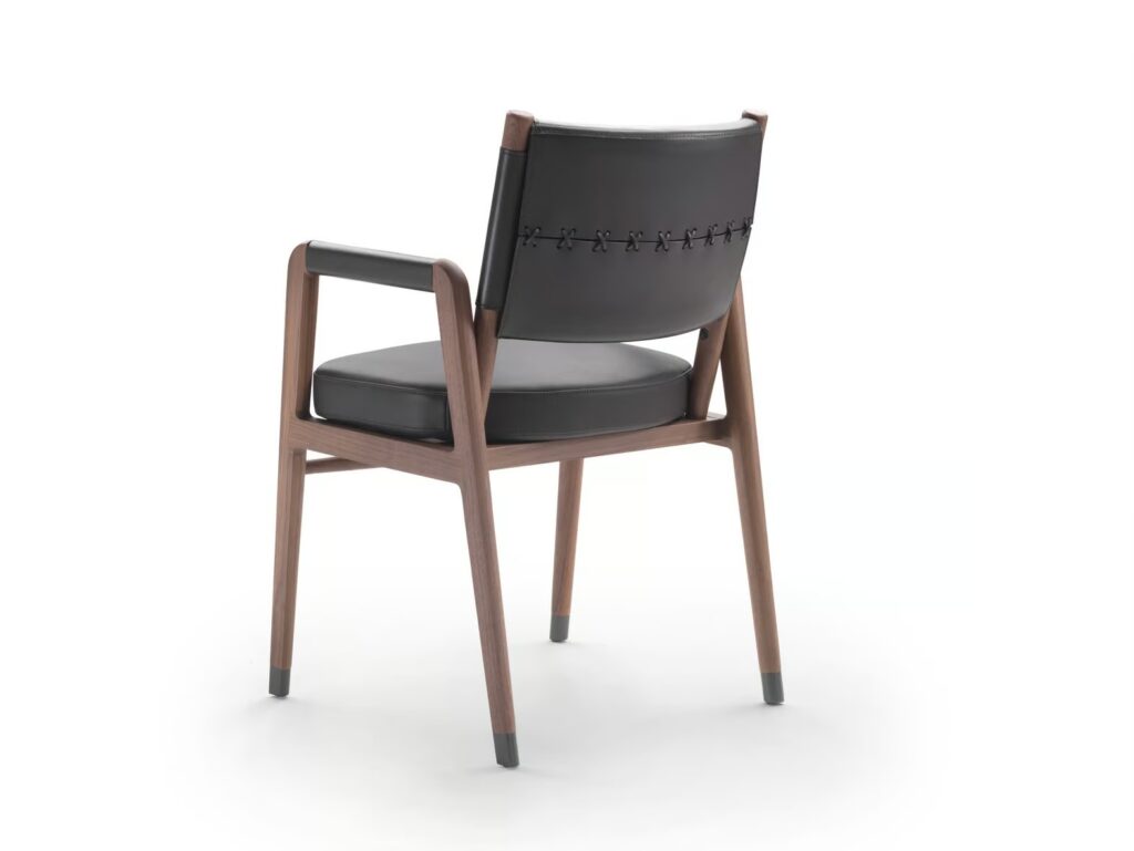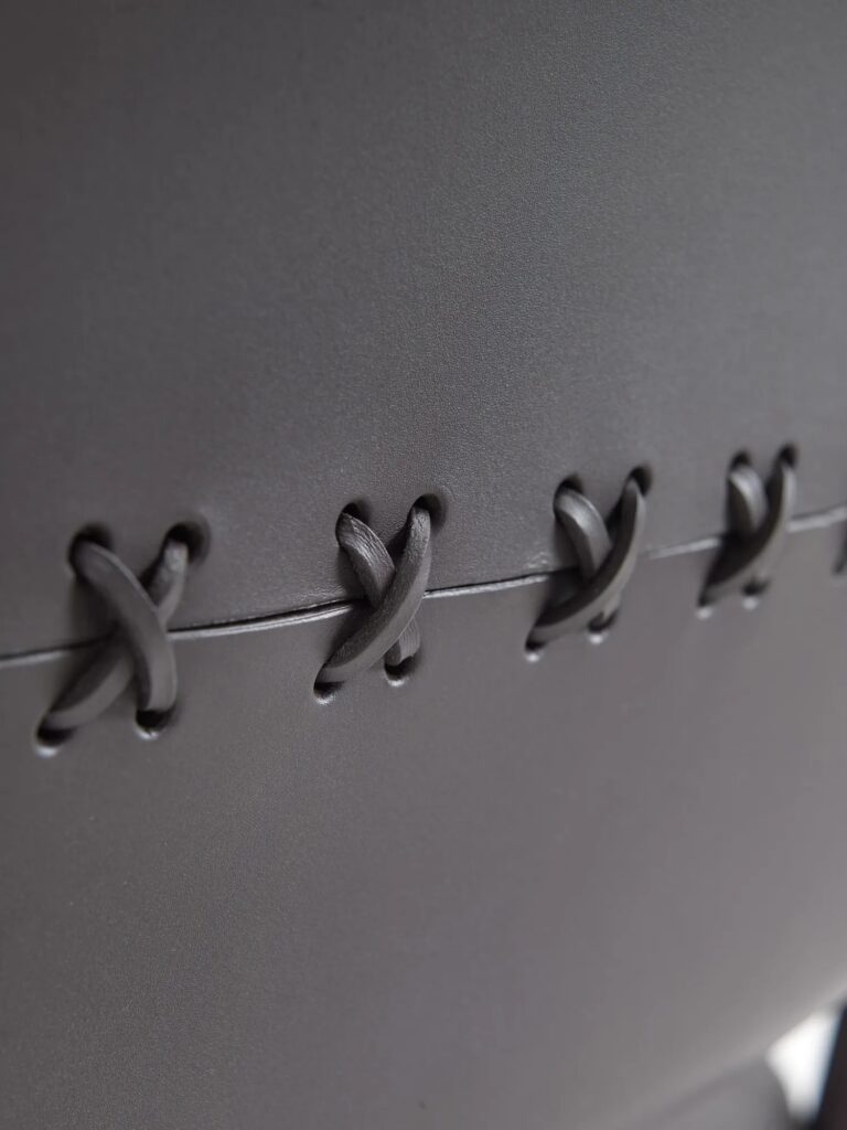 Die gepolsterte Sitzfläche kann mit Leder oder Stoff bezogen werden, während die Rückenlehne vollkommen aus Leder besteht und auf der Rückseite mit raffinierten Nähten versehen ist.
