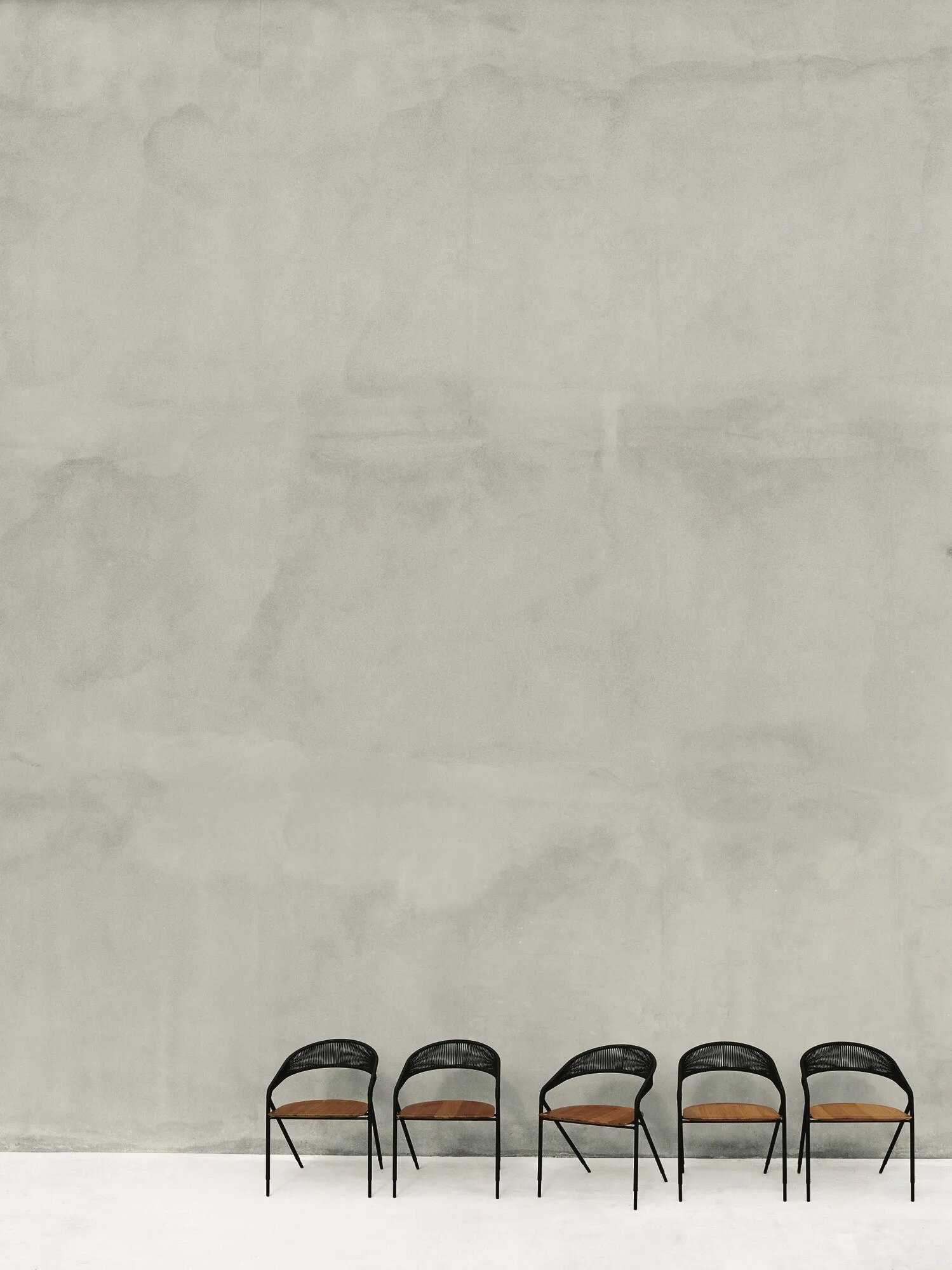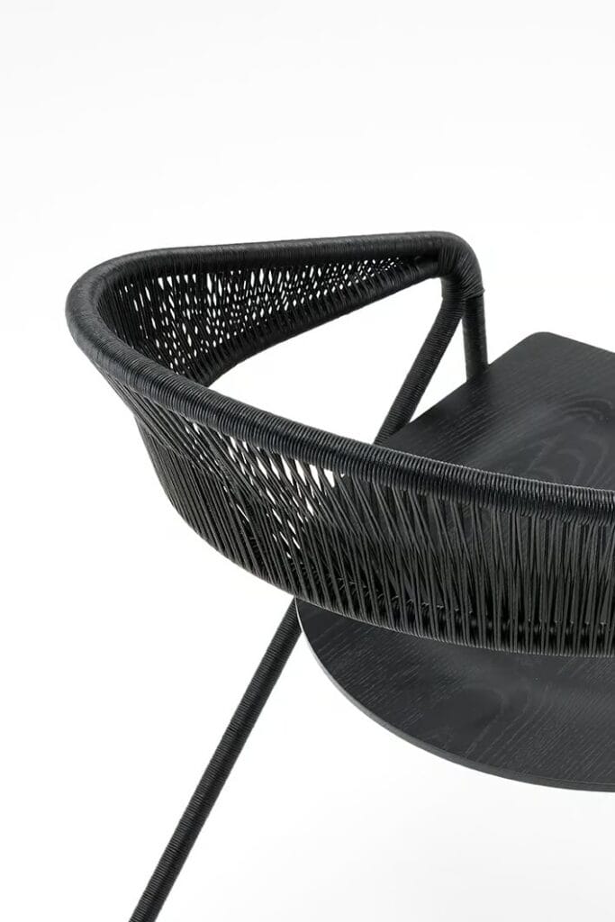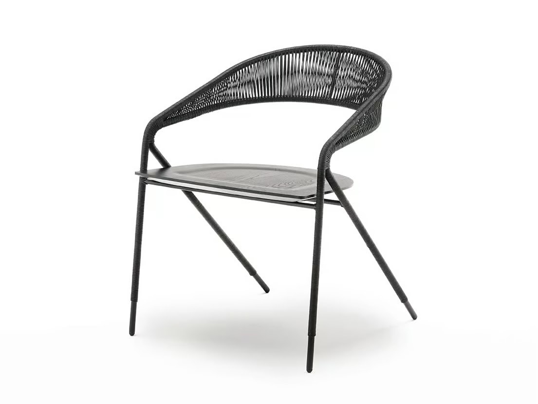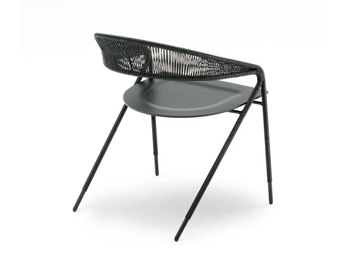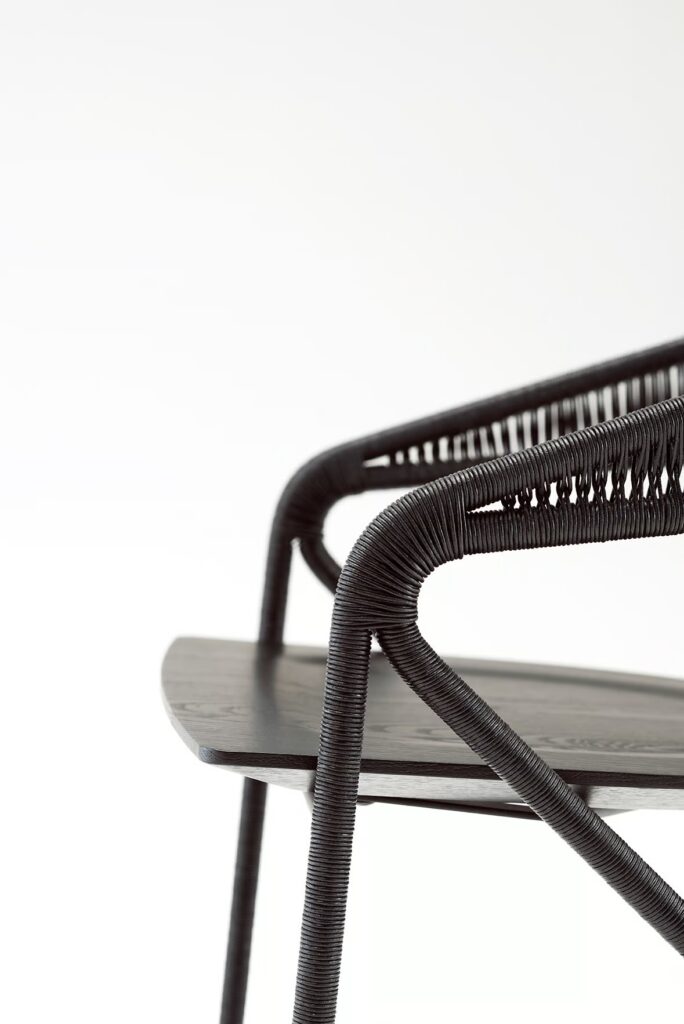 Outdoor-Version: Struktur in Rohr und Rundstahlprofil Querschnitt 15 mm lackiert mit einer Zinkbasis für den Aussenbereich und gefertigt mit Epoxidpulvern in der Farbe RAL K-7 9017 matt schwarz. Geflecht aus gewachstem Seil Ø 2 mm in den Ausführungen laut Katalog und Sitzfläche aus massivem Iroko.