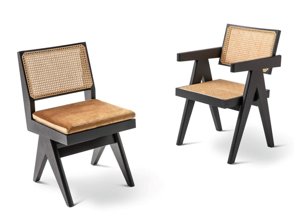 Dieser Stuhl ist eines der bekanntesten Modelle aus der Einrichtung des Capitol Complex in Chandigarh, der sich in mehreren Verwaltungsbüros des Secretariat-Gebäudes befand. Er besteht aus getrennten Elementen, darunter die seitlichen Stützen, die in Form eines umgekehrten „V“ positioniert sind, um zusammenlaufend die Armlehne zu stützen, die ebenfalls aus Massivholz gemacht ist. Das Korbgeflecht von Sitzfläche und Rückenlehne in einem Holzrahmen ist hingegen ein charakteristisches Merkmal für das Wesen des Ortes, das auch bei der Verwendung lokaler Holzarten wie Teak zum Ausdruck kommt. Genau wie der bekanntere Office Chair verwendet auch der Stuhl ohne Armlehnen die “V”-förmigen Auflagen, die in diesem Fall kürzer sind, weil sich sich nicht bis hin zur Armlehne erstrecken. Bei diesem Stuhl hat die Sequenz Sitzfläche-Rückenlehne aus Wiener Stroh Priorität; diese verlaufen kontinuierlich und werden durch zwei Profile aus Holz mit massivem geometrischem Querschnitt vereint. Diese Elemente strukturieren mit den komplanaren Beinen ein Gesamtbild, das mächtig und gleichzeitig einfach ist. Die Neuauflage von Cassina bietet ausser der historischen Version aus Teakholz zwei weitere, eine aus Eiche natur und eine aus schwarz gebeizter Eiche.