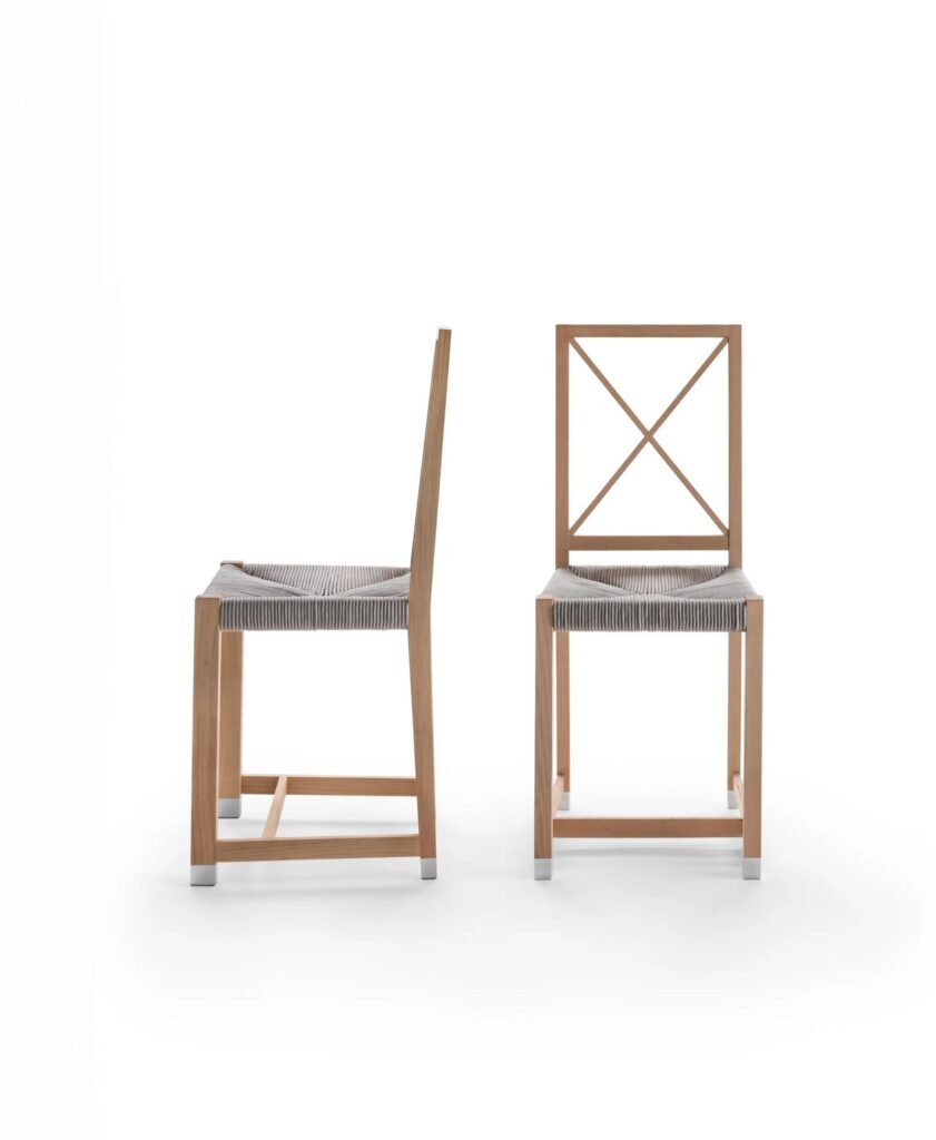 Der 1939 von Mario Asnago und Claudio Vender entworfene Stuhl Moka gehört seit 1985 zur Kollektion von Flexform und ist jetzt in der brandaktuellen Neuauflage für den Außenbereich erhältlich. Der überraschend moderne Charakter des Originalprojekts mit markanten Elementen des Rationalismus wird heute mit innovativen Materialien umgesetzt, die sich durch ihre hervorragende Wetterbeständigkeit auszeichnen. Das zierliche, elegante Gestell des Stuhls Moka Outdoor besteht aus Rundprofil aus rostfreiem Chrom-Nickel Stahl und ist auch mit Pulverbeschichtung in den Farben Weiß, Kaki, Weinrot und brüniert erhältlich. Die Rückenlehne ist durch die eleganten, überkreuzten Profile charakterisiert, die Sitzfläche besteht aus einem Geflecht aus Polypropylenfaser oder PU-Gummi, erhältlich in einer Farbpalette, die von natürlichen Tönen bis Bordeaux und Olivgrün reicht. Der Stuhl Moka Outdoor ist auch mit Gestell aus massivem Iroko in der Ausführung Natur, Weiß lackiert oder Grau gebeizt erhältlich, mit Gleitern aus Metalllegierung mit Nyloneinsatz.