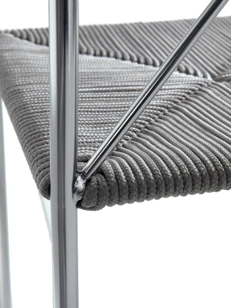 Struktur aus massivem iroko in den ausführungen natur, grau gebeizt, weiss lackiert oder aus rostfreiem stahl 316 elektropoliert, oder mit epoxidpulver beschichtet und gebrannt in den farben weiss 100, weinrot 405, kaki-grün 705, brüniert. Der sitz ist ein geflecht aus pvc strangguss mit nylon-kern in den farben anthrazit 7005, bordeaux 7002, weiss 7007, sand 7008, braun 7004, grün 7006 oder ein geflecht aus polypropylen-kordel in den farben sand 8001, anthrazit 8005, bordeaux 8002, grün 8006, weiss 8007, braun 8004.