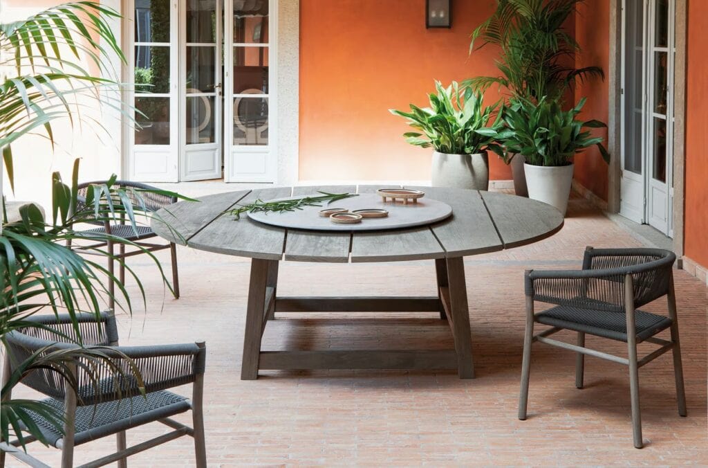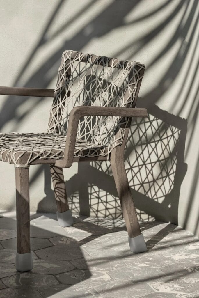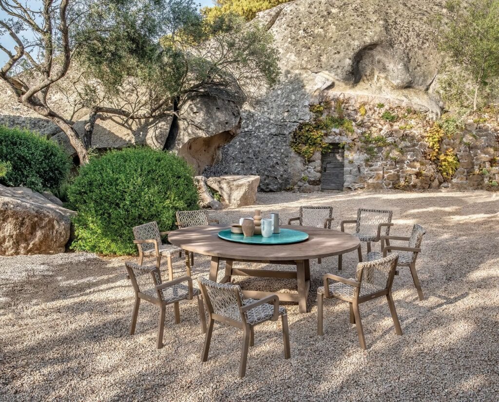 In einem perfekten Gleichgewicht zwischen Komfort und Design lassen sich die Tische von Rafael mit den Sesseln kombinieren. Ergonomisch und bequem, verbinden sie die Teakholzstruktur mit dem überraschenden Flechtwerk – aus den Schnüren Round Rope Light Grey – der Sitzfläche und bringen so die unverwechselbare eklektische Seele erneut zum Vorschein, die die gesamte Kollektion kennzeichnet.