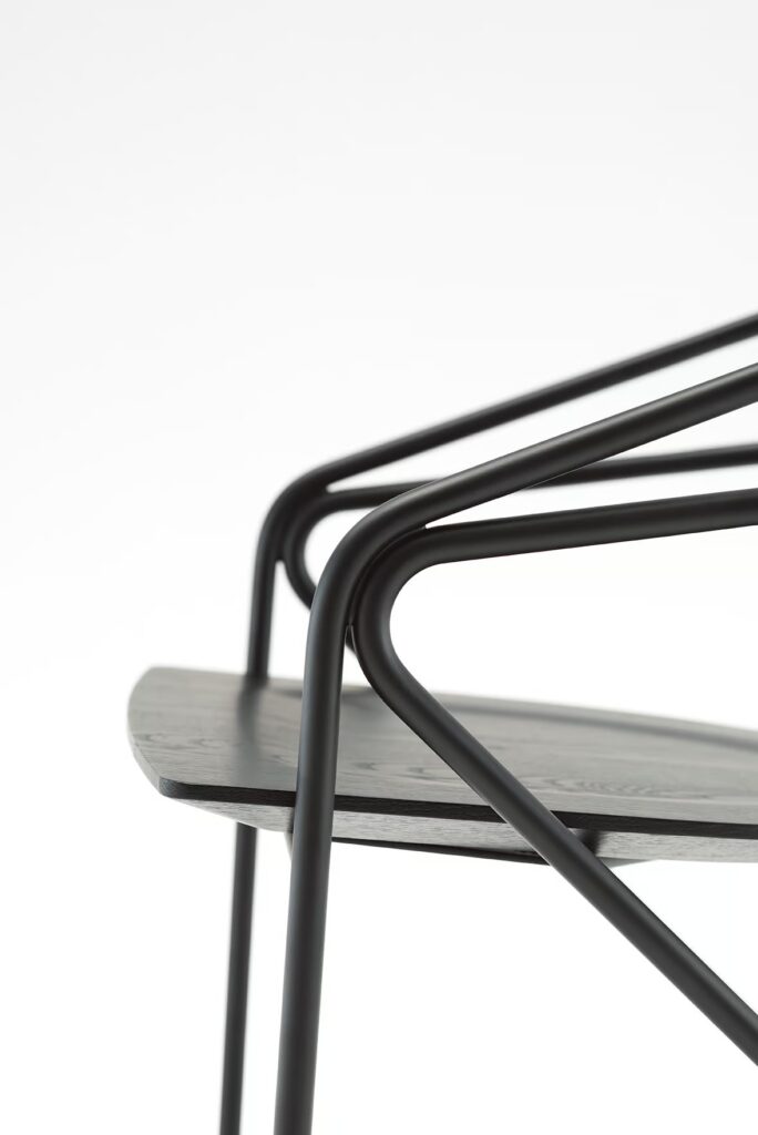 Indoor-Version: Struktur in Rohr und Rundstahlprofil Querschnitt 15 mm mit Epoxid-Pulverbeschichtung in RAL K-7 9017 matt schwarz. Gewebe in Korbseil (Ø 2 mm) oder Lederkordel (Ø 2,5 mm) oder gewachstes Seil (Ø 2 mm) und Sitzfläche aus massiver Esche in den Ausführungen laut Muster.