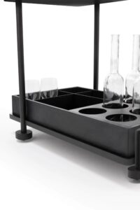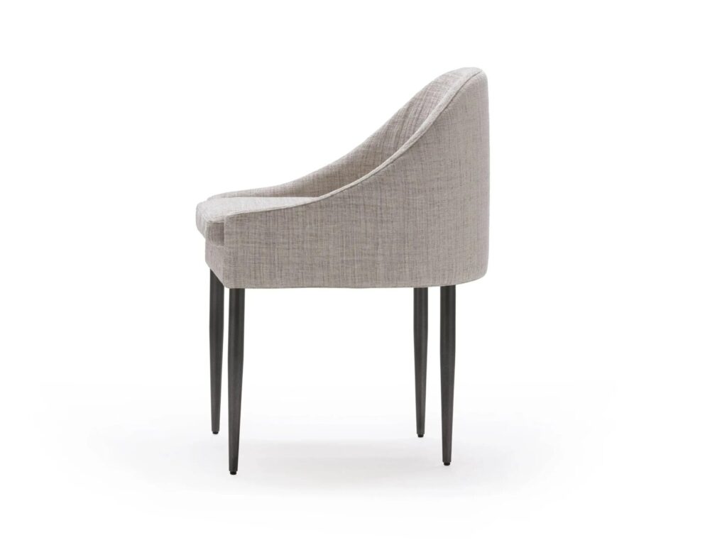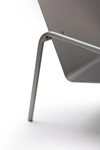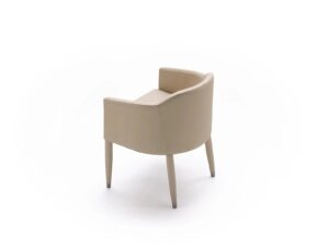 Tub armchair made of one-piece shell in poplar curved plywood with differentiated density polyurethane foam padding covered with a lining made of polyester fiber, with needle-treatment and resin-coated, coupled with a polyamide velveteen backing; also available with conical steel tube frame and legs, with epoxy polyester powder in Gunmetal grey or burnished color. For both versions seat cushion in polyurethane foam covered with a lining made of 100% polyether, coupled with a thermo fixed polyamide velveteen backing. Fabric or leather upholstery, fully removable with zippers and Velcro fastenings, and, for the version with “base”, by removing the frame and the seat pan from the seat structure. For the version with “base”, conical steel tube legs with epoxy polyester powder coating in Gunmetal grey or burnished color, fixed to the shell with screws. Floor support provided by plastic supports with interchangeable tips (in black plastic material or felt) depending on the type of surface for the version with “base”, and with adjustable plastic tips for the version “tub armchair”. Seat depth 45 cm.