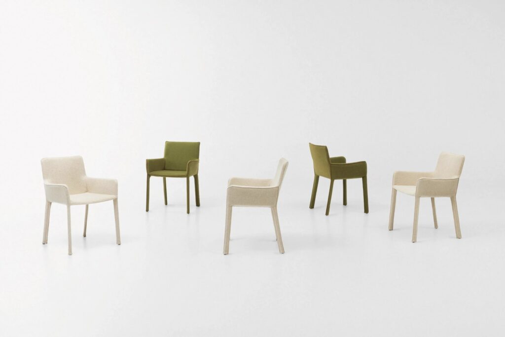 Mia is a chair with fabric upholstery. Internal structure in AISI 316 stainless steel, springing on elastic straps on the seat and backrest, plastic spacers. The upholstery, available in a selection of fabrics for interiors from the collection, covers the entire structure and is removable thanks to concealed zips.